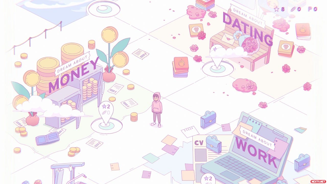 El otro elemento que llama la atención de Melatonin es su apartado visual, dibujado y animado a mano, con una sobredosis de colores pastel por todas partes, que ayudan a crear esa ambientación de sueños. Además, tanto las animaciones de comienzo y final de cada noche, junto a la de cada sueño, están animadas de manera excelente, a pesar de no tener una gran variedad de ellas ni en cantidad ni en variedad dentro de cada prueba.