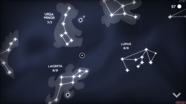 Y eso es todo lo que encontraremos en nuestro camino: descubrimiento. Los puzles de este título tienen una premisa muy sencilla y muy compleja al mismo tiempo: completar la constelación uniendo estrellas. ¿Dónde está la miga? En que cada constelación tiene sus propias normas. Contamos con una docena de constelaciones, cada una con entre 7 y 15 niveles principales. Cuando completamos dichos niveles, se abre cerca una especie de agujero negro en el que hay otro buen puñado de niveles, en los que se juega con las mismas normas que en esa constelación. Por lo tanto, tenemos puzles y desafíos para un buen puñado de horas.
