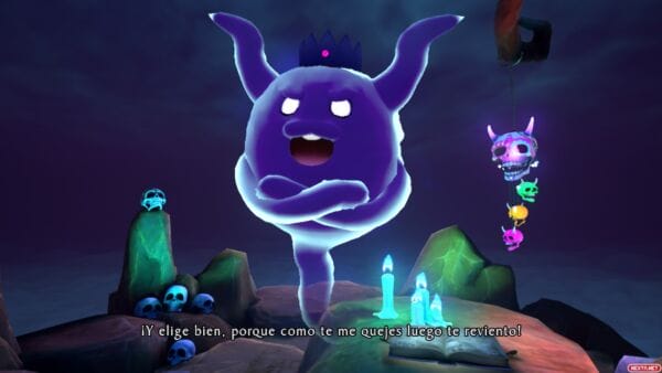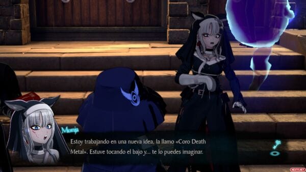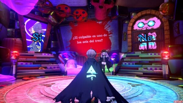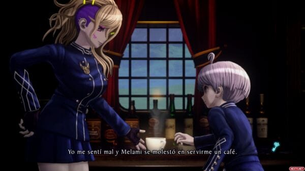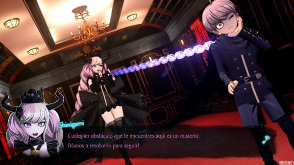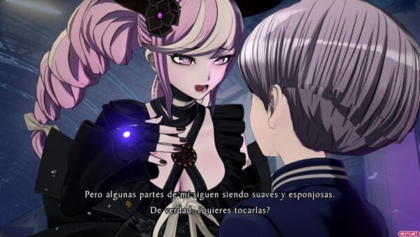 Por último me gustaría destacar dos cositas más en este apartado. Por un lado, la traducción, generalmente acertada, pero con algunos diálogos en particular, donde se nota que los traductores carecían de contexto y a veces confunden género de algunos personajes secundarios o terciarios. Lo que sí que no tiene explicación ninguna es como sí que confunden siempre y cada una de las veces el género de Halara Nightmare, que desde el primer momento dejan claro que es un personaje no binario, pero la traducción ni usa la «-e» como distintivo de género neutro, ni intenta dar rodeos para usar términos o palabras sin género definido, como sí hacen cada vez más obras adaptadas a nuestro idioma. La solución que toman la decisión de tratar a este personaje siempre en masculino, sin más. La otra cosa que puede que eche a gente hacia atrás es la propia Shinigami, cuya personalidad es bastante «fogosa», en el peor de los sentidos. Sobre todo al principio no hace más que hacer un comentario guarro o con doble sentido cada pocos minutos, sumado a ciertos planos cuestionables y gratuitos de los atributos de la chica, es normal, como mínimo, arquear una ceja. Pero es algo que a los seguidores de estos creadores tampoco les va a pillar de sorpresa, Danganronpa ya estaba cargado de este tipo de comentarios y escenas un tanto desafortunadas, pero que por suerte, ni son algo con lo que estén siempre bombardeando en pantalla, ni son esenciales para el trascurso del juego y la trama.