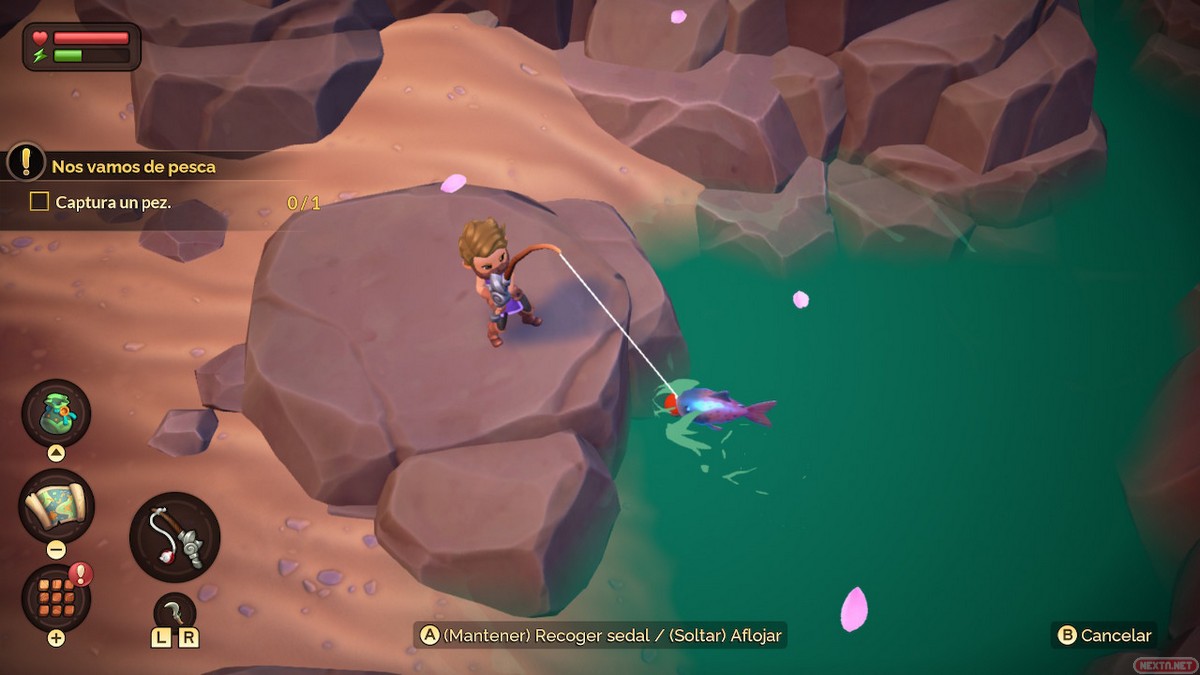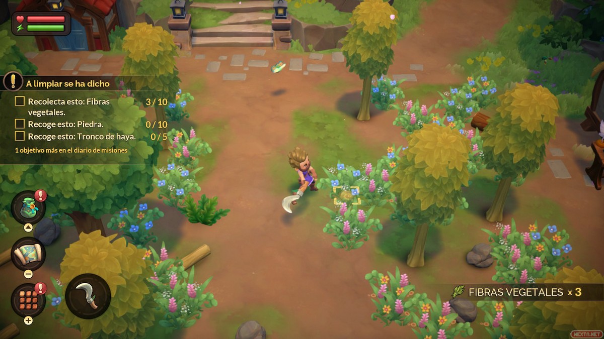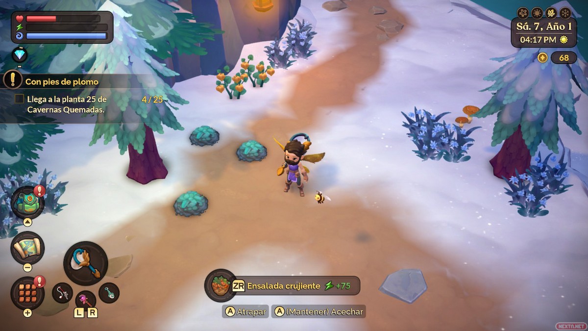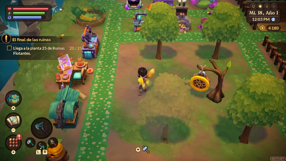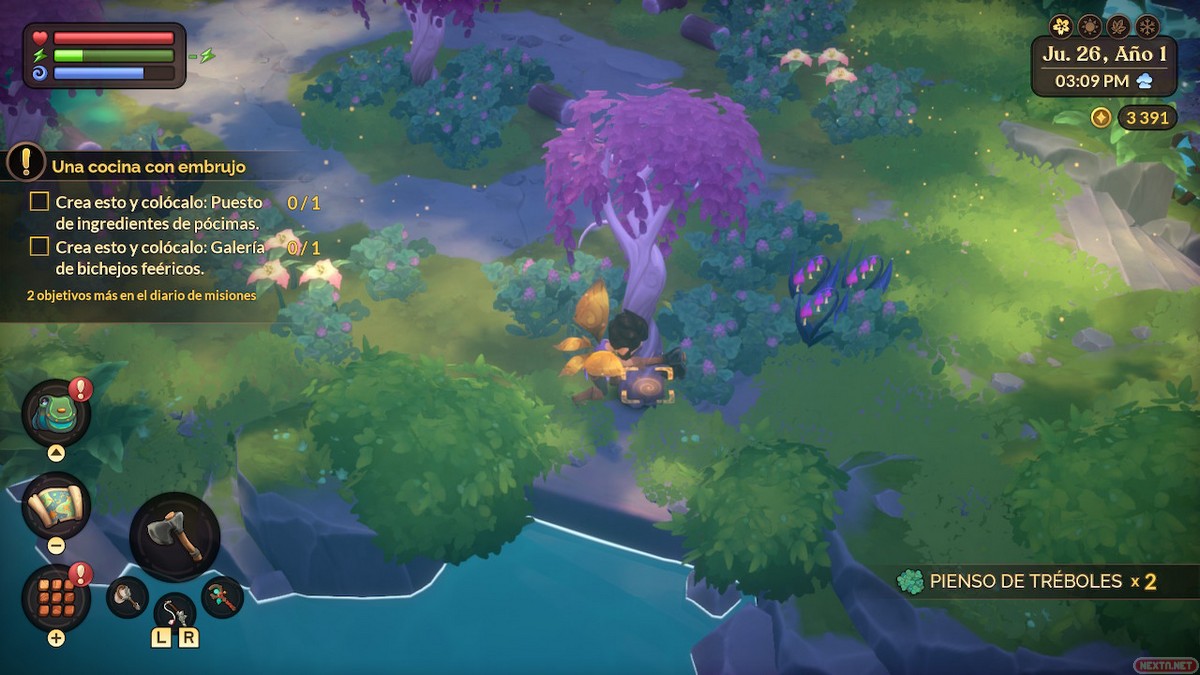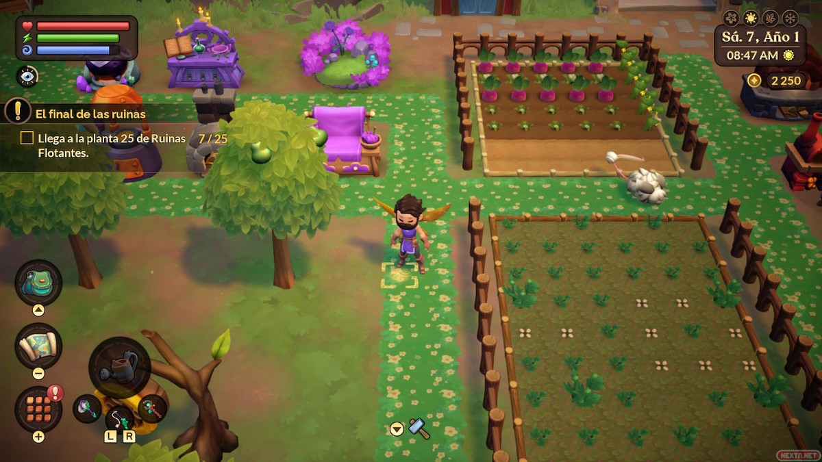 Las primeras misiones de Fae Farm están enfocadas a familiarizarnos con sus particularidades. No tardamos en darnos cuenta de que, en cuanto a configuraciones y calidad de vida, este título resulta de lo más interesante. Las herramientas de granja se intercambian automáticamente entre sí: si tenemos delante un árbol, se activa el hacha; si es un terreno sembrado, la regadera. Lo mismo sucede con hoz, pala y pico. Cosa aparte son la caña de pescar y la red cazabichos, así como la varita mágica, pero igualmente, cambiar de herramienta es súper sencillo e intuitivo.