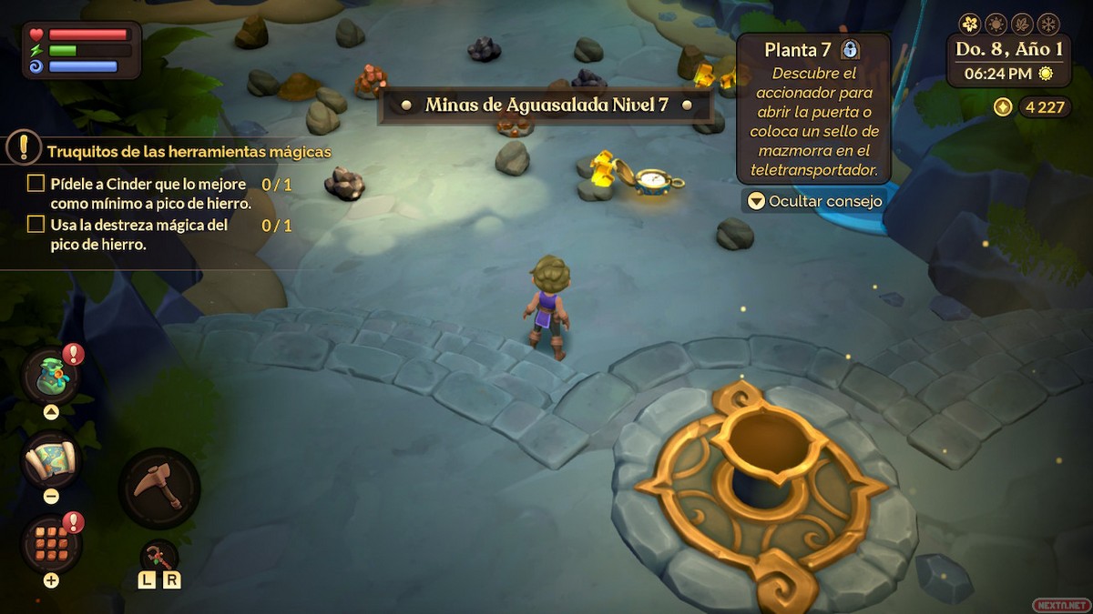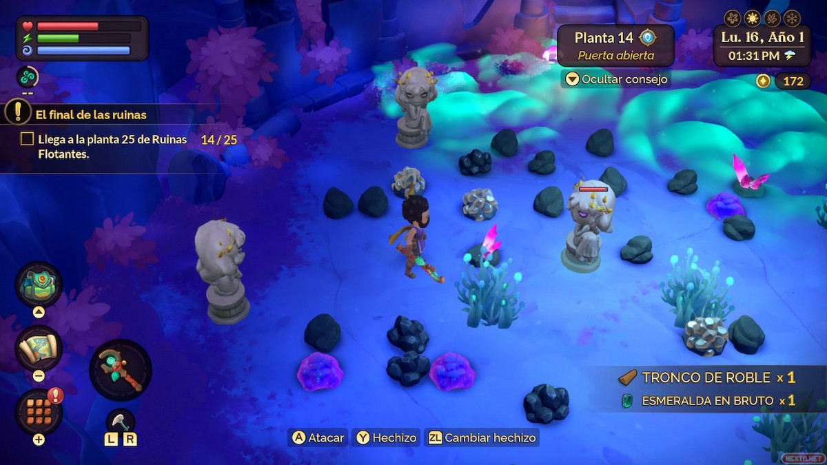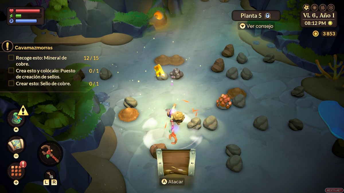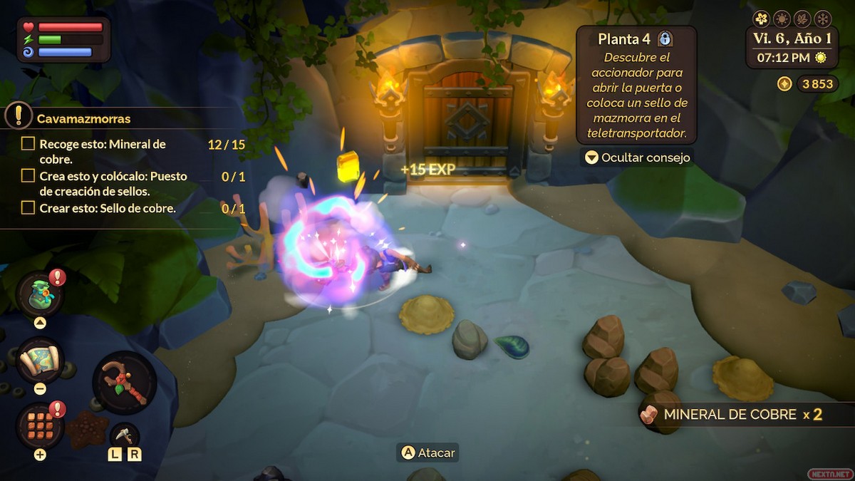 Por último, y más importante, está el tema de los sellos. Los minerales y gemas nos permiten fabricar sellos que, al colocarse en los pedestales de cada planta de las minas, nos permiten abrir automáticamente la puerta a la siguiente planta y activar a su vez un punto de viaje rápido que nos permite retomar la exploración de la cueva al día siguiente en el mismo punto en el que hemos colocado el sello. Así es como el título nos motiva a explorar y recolectar, y nos premia esa recolección facilitándonos el avance en intentos sucesivos. Además, hay sellos especiales que, colocados en los pedestales repartidos por la isla de Azoria, nos sirven también para hacer viaje rápido por toda su geografía.