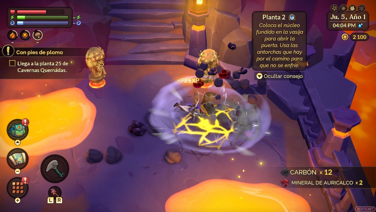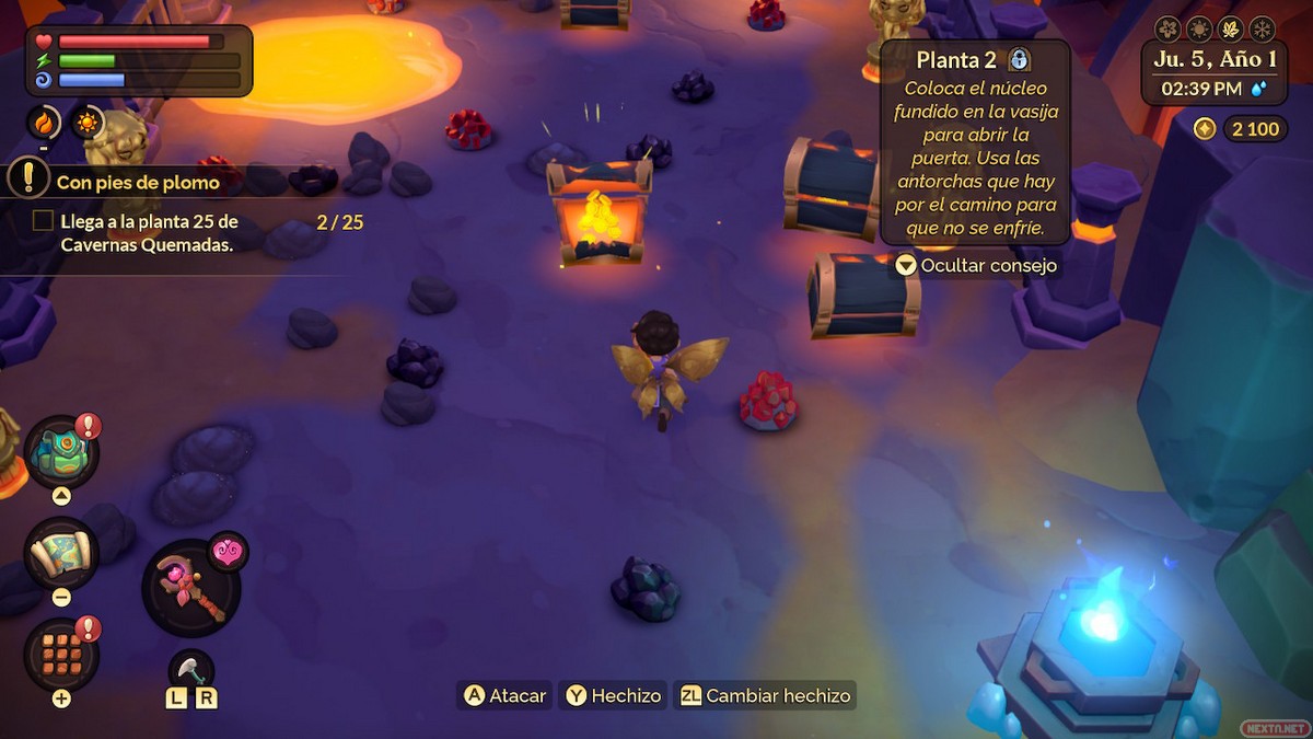 Al contrario de lo que se pueda pensar, las minas de Fae Farm no son simples biomas clónicos. Cada una tiene su propia personalidad propia y sus mecánicas particulares. En la primera, minar nos sirve para encontrar el botón de apertura de la puerta a la siguiente planta. En la segunda, en lugar de eso, debemos encontrar dos llamas. Y en la tercera y última, encontrar una llama y llevarla a su pedestal antes de que el tiempo se agote. Aparte, es necesario llevar pociones para resistir el ambiente venenoso o ardiente en la segunda y en la tercera. Estos detalles dan un toque propio a cada una de ellas, en vez de ser una simple sucesión de habitaciones en la que sólo cambian la estética y los materiales recolectables.