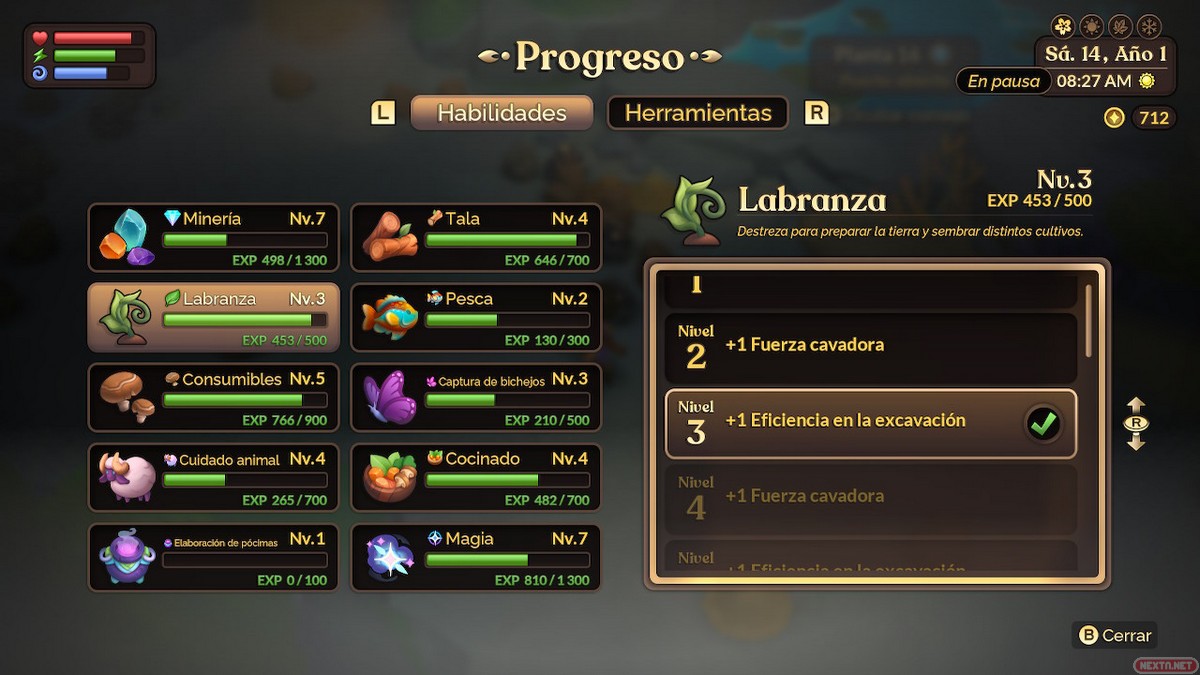 Fae Farm cuenta con varios sistemas de progresión. Cada una de las distintas acciones que llevamos a cabo (caza, pesca, siembra, siega, minería, lucha contra monstruos, cocina, etc) cuenta con su propia línea de crecimiento, en la que ganamos experiencia y subimos de nivel. A medida que aumentamos nuestro nivel, mejoran nuestras aptitudes en dicha opción, aumentando las posibilidades de obtener más recursos, o realizar la acción consumiendo menos energía. Y, en algunos casos, es necesario alcanzar cierto nivel para desbloquear nuevas herramientas o nuevas semillas a sembrar.