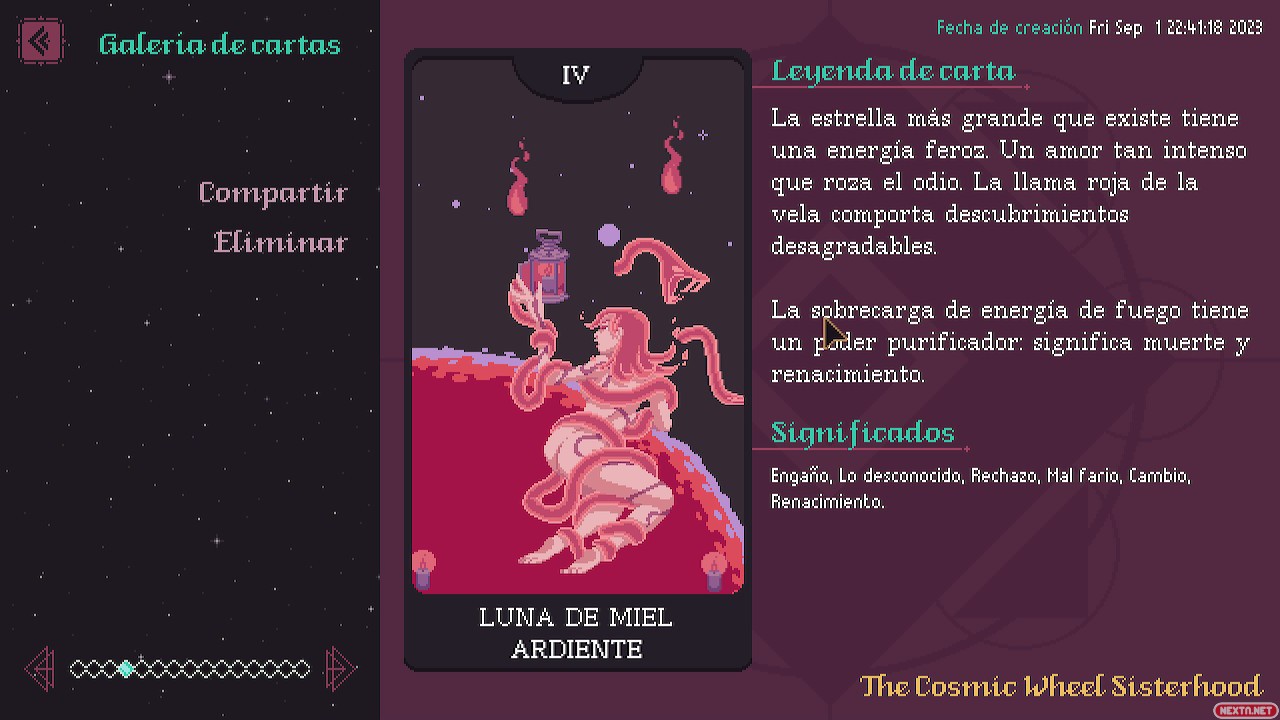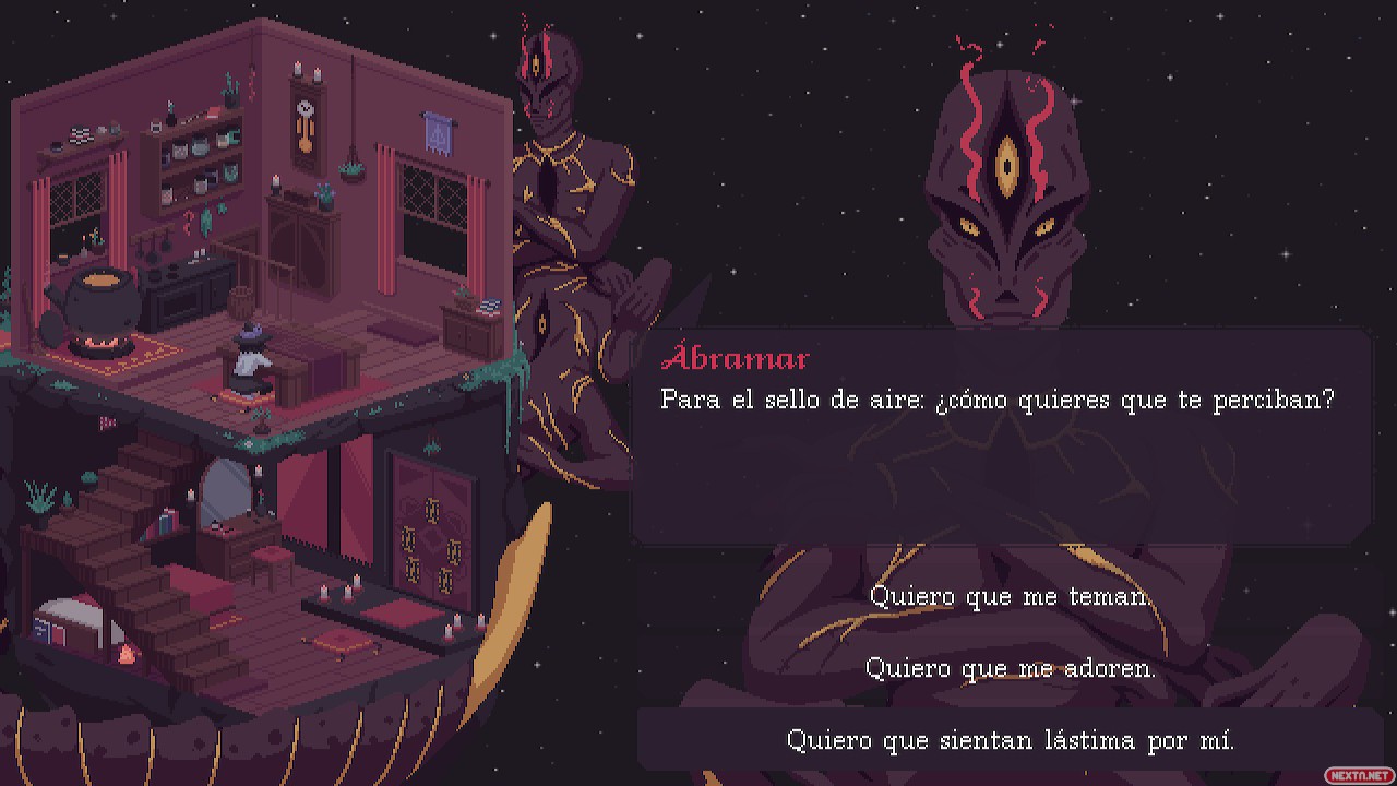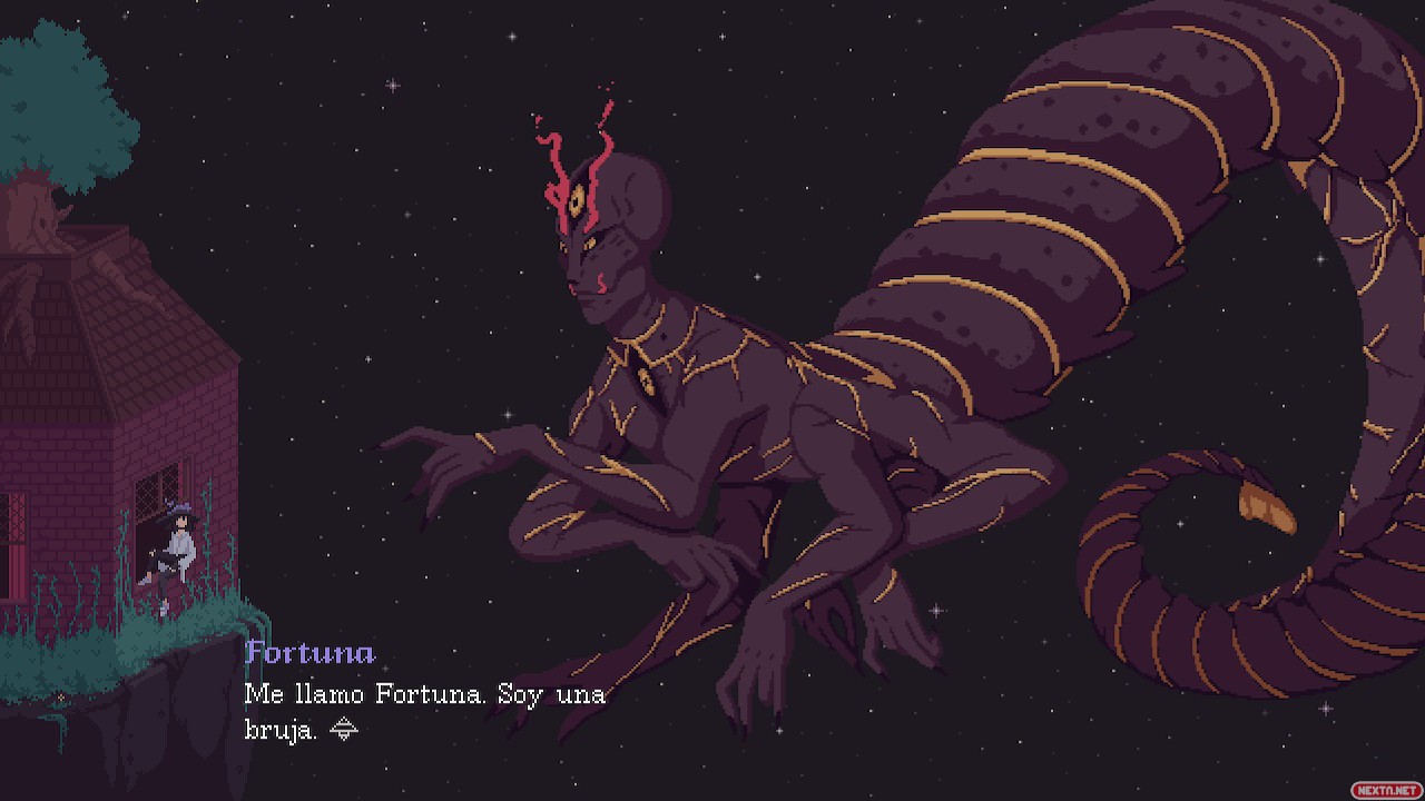 Pero estas no son las únicas razones por las que destaca The Cosmic Wheel Sisterhood. Empecemos con el apartado artístico: espectacular y sin duda cósmico. Los colores y diseños de cada personaje es lo que nos hace entender que, fuera de los muros que nos encierran, hay todo un cosmos ahí fuera con todo tipo de brujas, con sus personalidades y experiencias únicas. Y que hayan logrado plasmar todo eso mediante pixelart es elogiable. La música tampoco está nada mal: mayormente calmada y tranquila, recordándonos que no hay prisa, que hay que disfrutar cada momento con calma. Como único aspecto negativo diría que están los controles, sobre todo en el editor de cartas: cuesta un poco acostumbrarse a qué hace cada palanca o en qué formas puedo modificar las imágenes para lograr lo que yo quiero.
