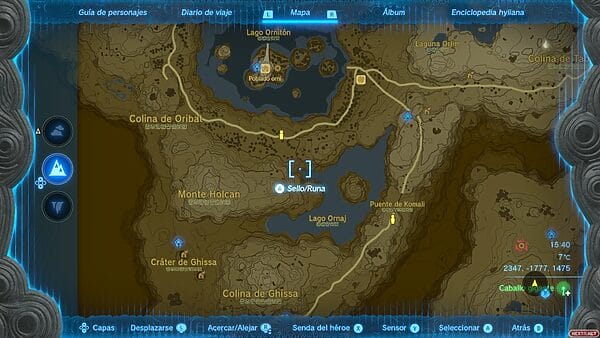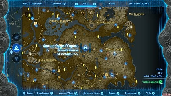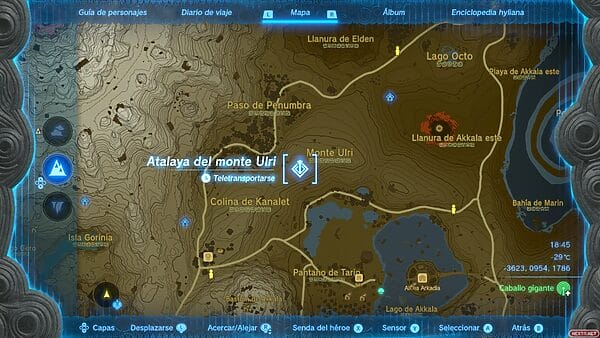 Una vez hayamos equipado la armadura zora tenemos que ir a la Plaza de Lanayru. Podemos teletransportarnos hacia el santuario de O’ogin, y usar la infiltración para ascender hasta la superficie. Si no lo has visitado aún, saltar desde la atalaya del monte Lanayru y descender en paravela hacia el oeste tampoco es mala opción. Personalmente, prefiero llegar desde la atalaya. Tienes que situarte en la orilla del extremo sur del lago.