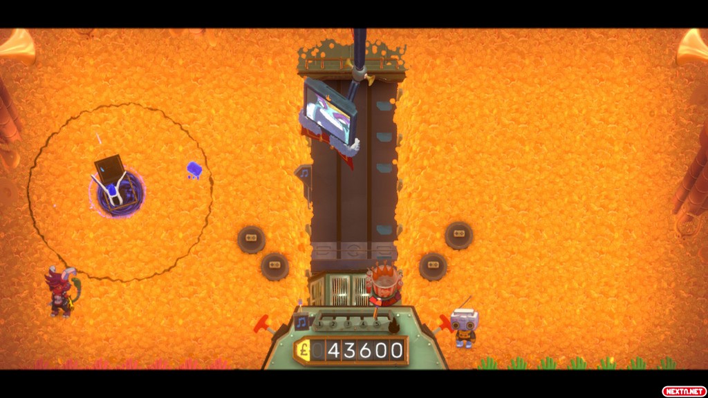 Como bien sabéis, no nos gusta hacer spoilers de la historia de los juegos más allá de lo estrictamente necesario, por lo que no vamos a desvelar secretos o sorpresas de la trama del juego. Os podemos contar que nuestro personaje (o personajes ya que podemos jugar hasta 4 personas en cooperativo local u online), busca al rey de un castillo para restablecer el orden del mundo rítmico. Ferdinand, que es el nombre del rey, nos impondrá toda una serie de diferentes desafíos (tanto justos como injustos) para llegar a la sala de su trono y enfrentarnos a él. Si bien la historia puede parecer anecdótica, lo realmente bueno de este aspecto del juego es lo bien que se compenetra con el desarrollo de los niveles: No estamos ante un juego donde haya que ir en linea recta de nivel en nivel escapando de diálogos soporíferos; SUPER CRAZY RHYTHM CASTLE tiene los diálogos justos y necesarios, cargados de humor, con un mapa que cada vez es más grande, que cuenta con diversos elementos con los que interactuar y donde hay que buscar la ubicación del próximo nivel, volviendo la exploración una parte más de la experiencia de juego.