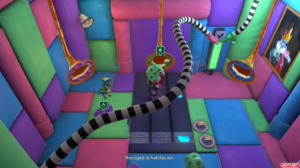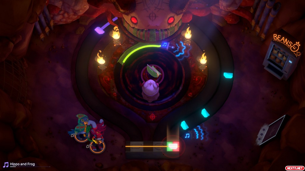 Por otro lado, aunque estamos ante un juego rítmico y mayormente veremos un panel donde hay que pulsar secuencias de botones a cierto ritmo concreto para superar los diferentes desafíos del juego. No obstante, prácticamente cada nivel tiene un pequeño giro de tuerca que rompe con la mecánica rítmica y nos obliga a superar algún desafío concreto: defendernos de algún enemigo, trasportar algún objeto a otro lugar de la sala, por lo que el ritmo de juego se rompe, en el mejor sentido, dando lugar a una jugabilidad muy fresca en lo que se refiere a juegos musicales. Haciendo una comparación algo exagerada, es como si Overcooked tuviera juegos rítmicos.