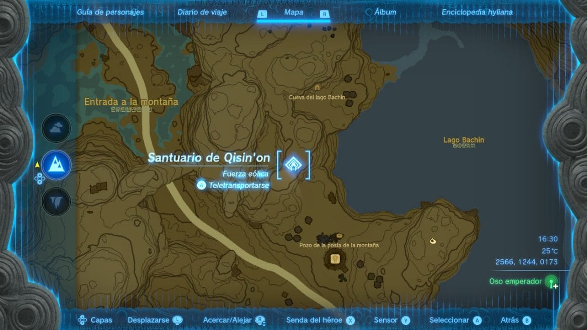 La cueva no es laberíntica: solo puedes avanzar en una dirección. Hazlo hasta llegar a una sala grande que tiene un llamativo pilar central custodiado por un Hinox esquelético. Puedes acabar con él o no, según la prisa que lleves, aunque supone un estorbo considerable. Sigue el rastro de los pendones de Nambod hasta uno de los pilares del fondo. Solo tienes que subir por él para dar con el altar y consiguientemente con el cofre que contiene la máscara de la deidad.