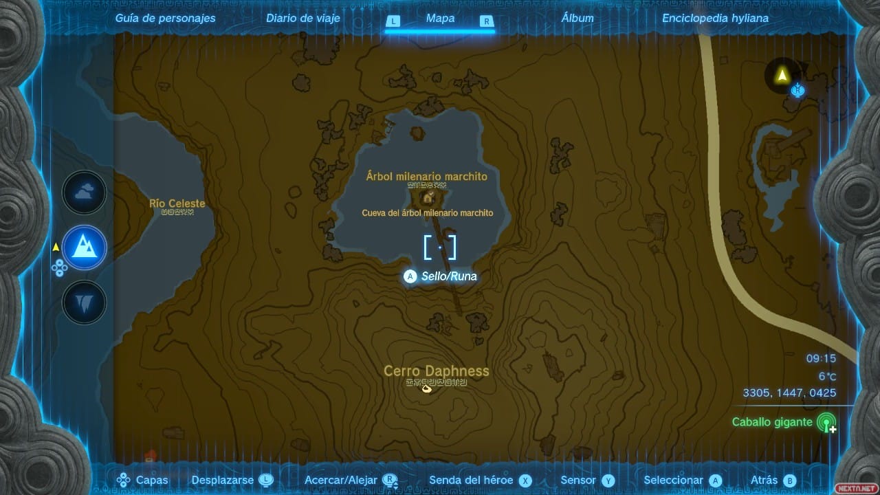 La última pieza del conjunto está al oeste de la llanura de Hyrule, en la Cueva del Árbol Milenario Marchito. No tiene pérdida: es un tronco de árbol gigantesco en el centro de un lago. El mejor sitio al que teletransportarse, y queda bastante lejos, es el santuario de Susuai. Puedes acceder al árbol desde el lago, trepando, o desde la zona sur del acantilado que lo rodea, donde hay un puente bastante pintoresco que lleva directamente hacia él. Una vez allí, tírate hasta la cueva. Este lugar resulta algo confuso pues las únicas referencias que tenemos para orientarnos son ramas, raíces y agua, pero no te preocupes. Desde el punto en el que caes, desplázate en dirección sur-sudeste. Verás una raíz enorme saliendo del agua y al final una entrada cubierta por lianas. Avanza hasta ellas y córtalas.