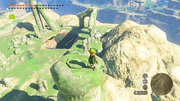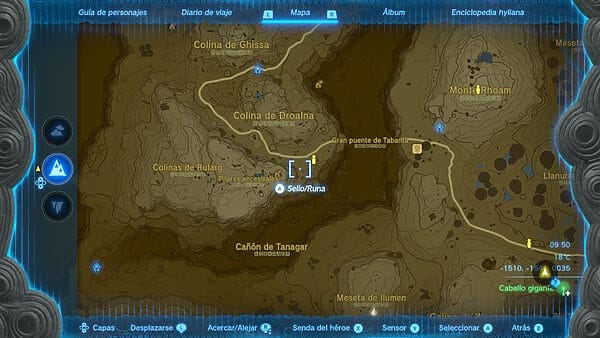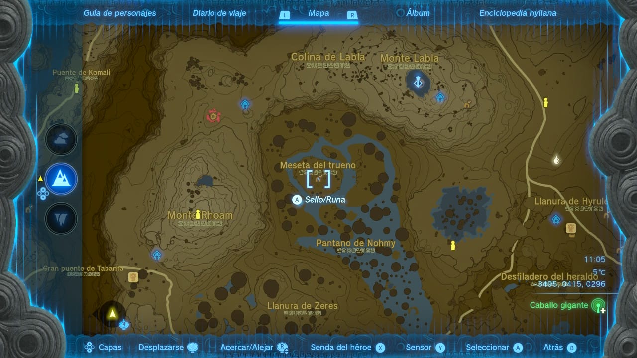 Para conseguir la última parte del set tenemos que ir a la zona centro de las Colinas de Hyrule, donde se encuentra la Meseta del Trueno. Si quieres teletransportarte hay multitud de referencias, pero la más rápida quizá sea la Atalaya del Monte Labla. La máscara está en la cueva de la meseta del trueno, y como ha ocurrido hasta ahora, al llegar veremos que está bloqueada por una compuerta. Además está rodeada por cuatro pilares.