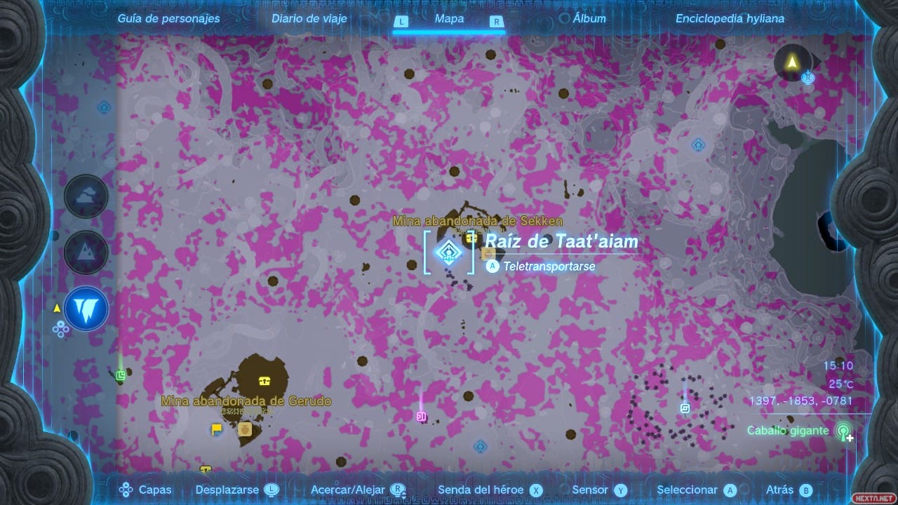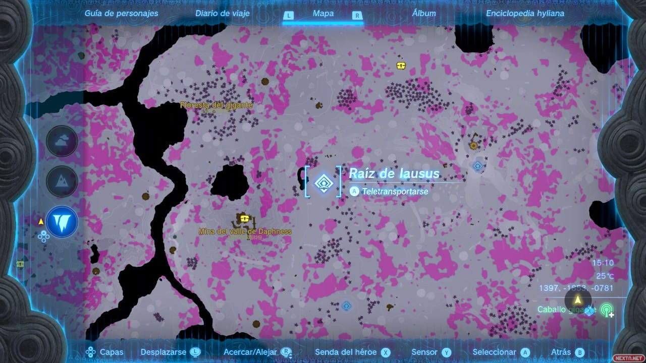 Después de conseguir la coraza en la Mina del Valle de Daphness, solo tenemos que avanzar en dirección sur. Un largo trecho, sí, pero prácticamente sin desvíos. Solo tendremos que bordear un pared de roca que rodea el Coliseo Flotante, pero si no nos alejamos mucho, en cuanto la dejemos atrás será solo seguir hacia el sur. ¿Nuestro objetivo? La Mina del Valle de Hylia. Antes de alcanzar este lugar, es probable que pasemos por la Gran Mina Abandonada Central. En este punto, hay que desviarse ligeramente en dirección oeste, para seguir caminando rumbo sur-suroeste. Orientarse es fácil porque la raíz de Nu’qoarat se ve claramente. Si no quieres seguir el recorrido lineal que proponemos aquí para conseguir el atuendo completo de una sola pasada, las referencias más cercanas son la mencionada raíz y el Abismo Sur de la Meseta. Desde cualquiera de esos puntos, solo hay que avanzar hacia el oeste.