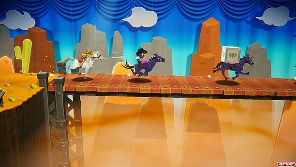 Que cada nivel tenga que aprovechar las habilidades únicas de cada transformación hace que la variedad de niveles se vuelva muy agradable para el jugador. Lejos de ser niveles repetitivos o poder superarlos corriendo esquivando enemigos, se disfruta la intriga hasta que se descubre cómo ha pensado Nintendo que es mejor aprovechar cada transformación. Basándonos en las 4 transformaciones que hemos probado, os contamos cómo cambia cada acto. Con Peach Repostera, nuestra habilidad es decorar tartas y pasteles en una especie de minijuego, mientras que con Peach Espadachina, al poder esgrimir una espada, la jugabilidad se centra más en derrotar enemigos y en esquivar ataques, si volvemos al ejemplo mencionado anteriormente, Peach Ninja, el acto nos ofrece más momentos de plataformeo y sigilo. Para finalziar, con Peach Vaquera, hay hasta momentos de persecución a caballo mientras utilizamos el lazo para atrapar enemigos.