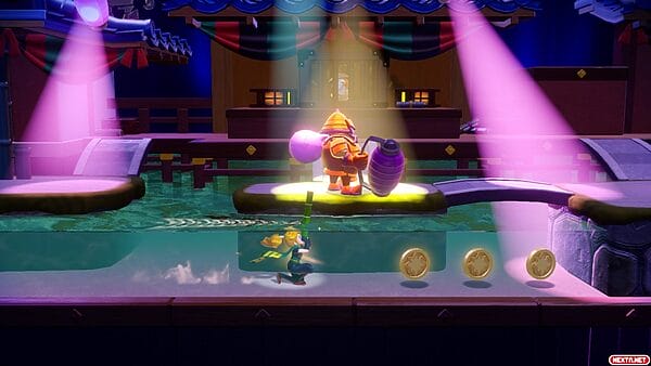En Princess Peach Showtime!, la jugabilidad es muy sencilla, tenemos un botón para saltar, nos desplazamos con el joystick izquierdo y contamos con otro botón para utilizar las habilidades únicas de cada transformación. Todas estas transformaciones de las que estamos hablando, hacen de potenciadores o «Power-ups» si os gusta la denominación anglosajona, pero con un pequeño giro de tuerca. Las fases de este título se representan como pequeños actos teatrales y cada acto es temático según la transformación. Es decir; en un acto donde la transformación es Peach Ninja, por ejemplo, la ambientación es acorde a la temática ninja y el propio nivel se adapta a las habilidades únicas de esta transformación. Cabe destacar que aunque hayamos hecho alusión a los potenciadores, a diferencia de lo que estamos acostumbrados en títulos de Mario, por ejemplo, estas transformaciones son permanentes durante el acto, ya que necesitamos esas habilidades para avanzar por la fase.