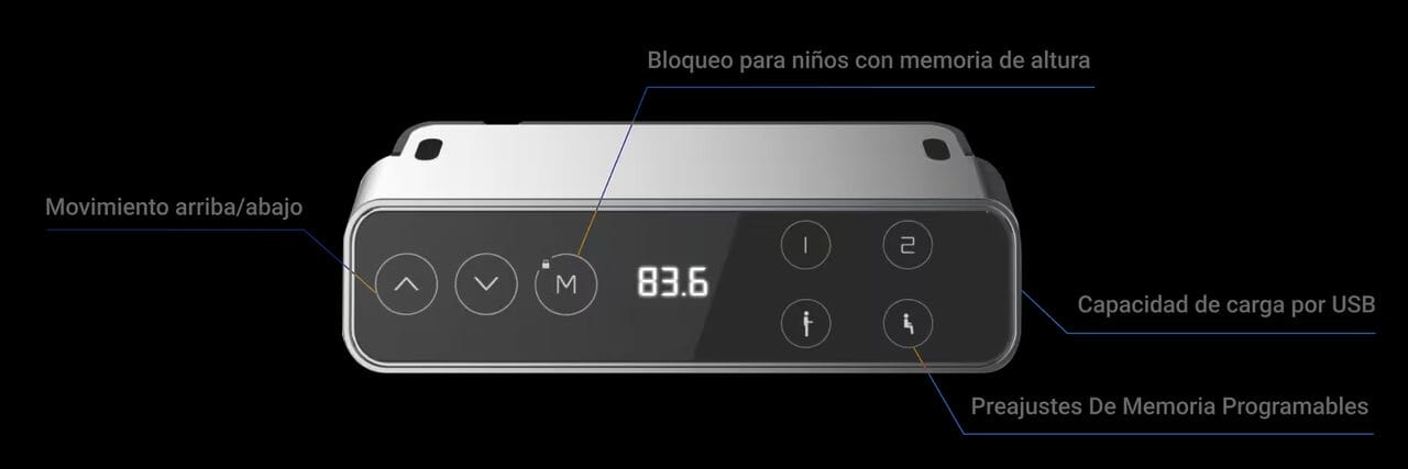En lo que respecta a las posibilidades de movilidad, el escritorio E7H permite almacenar hasta 4 alturas preestablecidas. Cuestión que resulta de agradecer tanto si sois uno como si son varios los usuarios destinados a su uso. No vamos a negar que, tras tantas horas tras la pantalla, poder combinar momentos sentados con otros de pie o en taburete alto resulta muy de agradecer. Por su parte, la pantalla de gestión táctil (atornillable tanto a la derecha como a la izquierda) resulta bastante intuitiva. No tiene ningún misterio. Apagándose tras unos segundos sin usarla para ahorrar energía. En la parte lateral de dicho panel se sitúa una entrada USB compatible con Quick Charge 3.0 de hasta 12V. Algo que, eso sí, se nos ha antojado escaso para montar un centro multimedia.