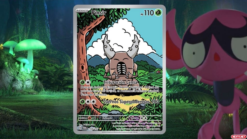 El Juego de Cartas Coleccionables de Pokémon, como ya sabéis, Pokémon JCC abreviado en español o Pokémon TCG (siglas de Trading Card Game en inglés), no deja de crecer. En anteriores ocasiones ya os hemos enseñado diferentes cartas nuevas que debutaban en las más recientes expansiones del juego de cartas y hoy no es una excepción. Si estáis al tanto de las novedades respecto a las cartas de Pokémon seguro sabéis que seguimos explorando las posibilidades que la región de Paldea nos ofrece. Sin embargo, lo que quizá no es tan conocido es que la nueva expansión de Pokémon JCC, Mascarada Crepuscular, tiene como protagonista a uno de los Pokémon de la primera parte del pase de expansión de Escarlata y Púrpura: Ogerpon. De hecho, su afición por las máscaras hace que sea un Pokémon con muchas posibilidades a la hora de ofrecernos artes interesantes y cartas únicas. Sin embargo, la carta que os presentamos hoy es nada más y nada menos que uno de los bichos (en el mejor sentido de la palabra) más queridos de Kanto: Pinsir.