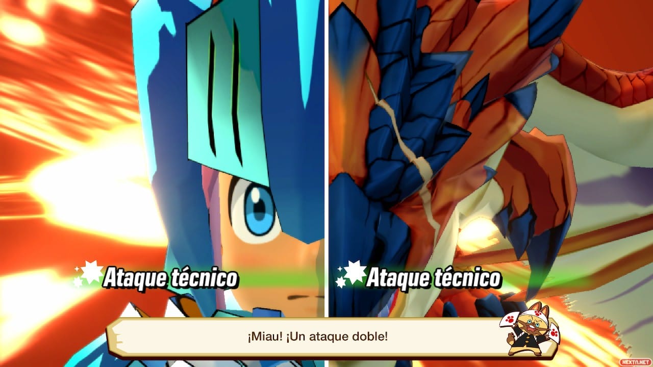 Después llegamos a los combates, donde Rider y Monstie cooperan para luchar contra les rivales. Aquí la clave se halla en los ataques de tres tipos (potente, ágil o técnico) y las compatibilidades (rojo vence a verde, verde a azul y azul a rojo). Cuando un rival y une de tus personajes se atacan mutuamente, se produce un Cara a Cara y la victoria va para quien tenga la ventaja de color. Este sistema (junto a las diferentes habilidades de cada personaje) plantea un enfoque muy estratégico: si sabes predecir el comportamiento del monstruo, que suele ser un aspecto crucial en Monster Hunter, puedes obtener la victoria con facilidad. Esto resulta crucial sobre todo contra los jefes, y en especial los ataques combinados (tú y tu Monstie usáis el mismo tipo de ataque y vencéis en un Cara a Cara): los jefes pueden ser temibles y es necesario aprovechar todas las oportunidades posibles para tener ventaja.