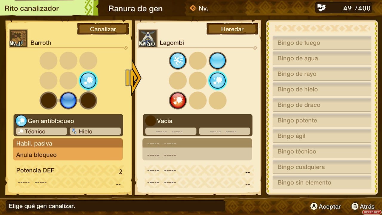 La personalización suele ser un tema crucial en esta clase de juegos y Monster Hunter Stories ofrece muchas opciones tanto para Rider como para los Monsties. Del primere es sencillo: con las partes de monstruo que recolectamos de los combates podemos fabricar armas y armaduras (aquí la armadura completa es un único objeto). En cuanto a los Monsties, está el sistema de genes y el rito canalizador: cada Monstie cuenta con genes aleatorios que proporcionan habilidades activas y pasivas, y estos se pueden transferir entre diferentes Monsties. Esto supone sacrificar al Monstie donante (en realidad lo liberas, ningún monstruo sufre daños), pero te permite personalizar cada Monstie con habilidades únicas y diferentes para que sea cada vez más fuerte.
