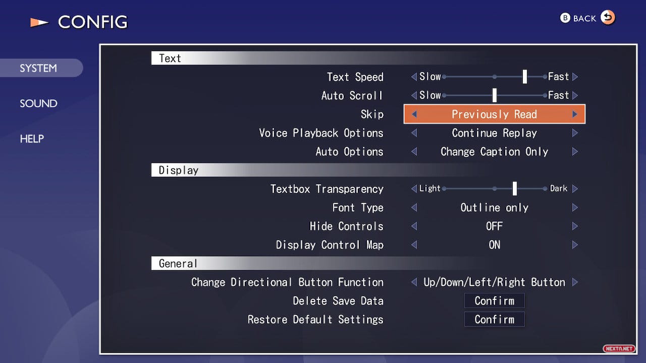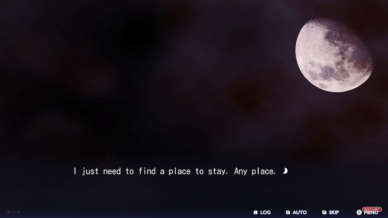 Por lo demás, la jugabilidad es la esperable de una novela visual de hoy en día. Es decir, pone a nuestra disposición un «log» por si nos saltamos algún texto sin querer, un slot de autoguardado, 63 slots normales, un modo automático que hace que el jugador se pueda ahorrar presionar la «A» para avanzar, la posibilidad de ocultar la interfaz para observar fondos e ilustraciones con comodidad y el ya clásico «Skip». De base está configurado para que solo se puedan saltar textos ya leídos, pero desde el menú de opciones es posible poner que todos los textos sean saltables.