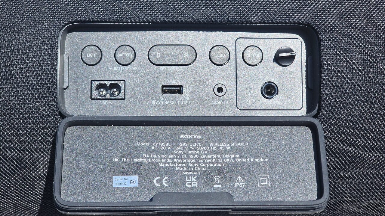 En cuanto a botones, la botonera del altavoz de Sony es bastante agradable al tacto y ofrece bastante sensación de seguridad ante la humedad. El botón ULT activa (o desactiva) los dos modos especiales de graves, que casi siempre dejarás en el nivel 1. La iluminación del botón ULT es hipnótica, va al ritmo de la música y de las luces que tiene el altavoz a cada lado.