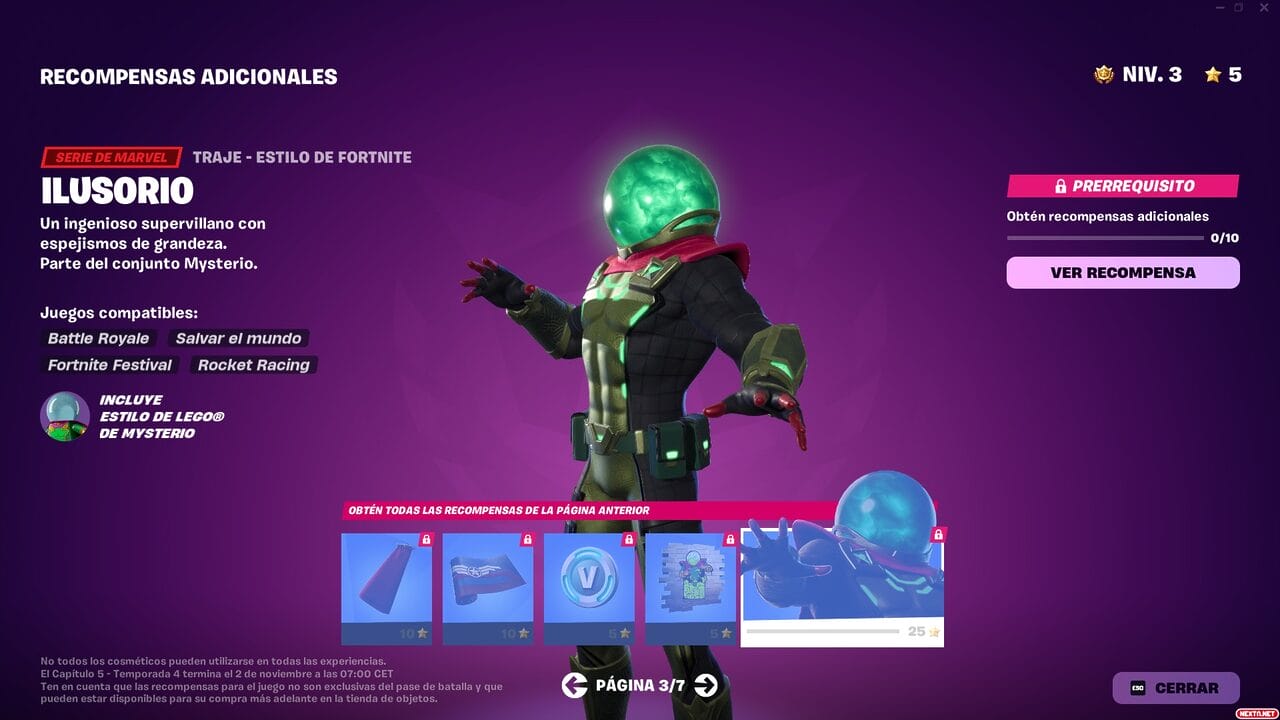 Al igual que en temporadas anteriores, el Pase de Batalla del Capítulo 5 – Temporada 4: Alerta Doom de Fortnite cuesta 950 paVos, con la posibilidad de conseguir 1500 paVos, aspectos y cosméticos exclusivos (durante al menos 18 meses) conforme subas de nivel al jugar a cualquiera de los modos de juegos de Fortnite o las Islas de Creadores de la comunidad. Como también viene siendo habitual, otra de las formas de conseguir el Pase de batalla de Fortnite Capítulo 5 – Temporada 4: Alerta Doom es suscribiéndote durante un mes al Club de Fortnite, la suscripción mensual del Battle Royale de Epic que ofrece el Pase de Batalla, 1000 paVos, una skin con todos sus accesorios y el Pase de Batalla de Rocket League por 11,99 €. Las recompensas que podrás conseguir en este Pase de Batalla son las siguientes: