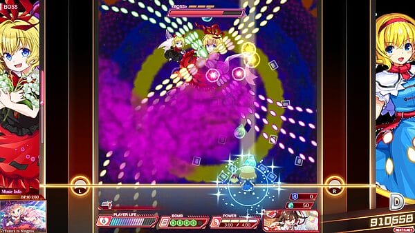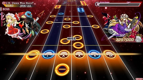 Por desgracia, el modo historia sí que se guarda una serie de pantallas exclusivas de modo y esas son los combates Danmaku contra los jefes. Son canciones especiales que abandonan el formato de notas en carriles y le dan un giro musical a las peleas de Danmaku clásicas de la franquicia, teniendo que esquivar, disparar y recoger potenciadores moviendo nuestros personajes al ritmo de la música obligatoriamente con los botones de los Joy-Con.