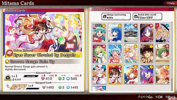 En realidad Danmaku Kagura Phantasia Lost no es la primera iteración del título. El Danmaku Kagura, sin Phantasia Lost, era un juego de ritmo para smartphones (de ahí que el sistema de control pensando fuese el táctil) con elementos de gatcha y es algo que se nota en el desarrollo del modo historia. Conforme avanzamos en la historia y cumpliendo objetivos de cada uno de los diferentes capítulos, iremos ganando más personajes y cartas Mitama, unas ilustraciones realizadas por diferentes artistas que podremos equipar a los personajes. Cada personaje y carta Mitama tiene sus propias estadísticas, niveles y habilidades especiales que nos permiten hacer frente a las distintas peculiaridades de cada nivel. Y es aquí donde se siente sus origines como juego para móviles.
