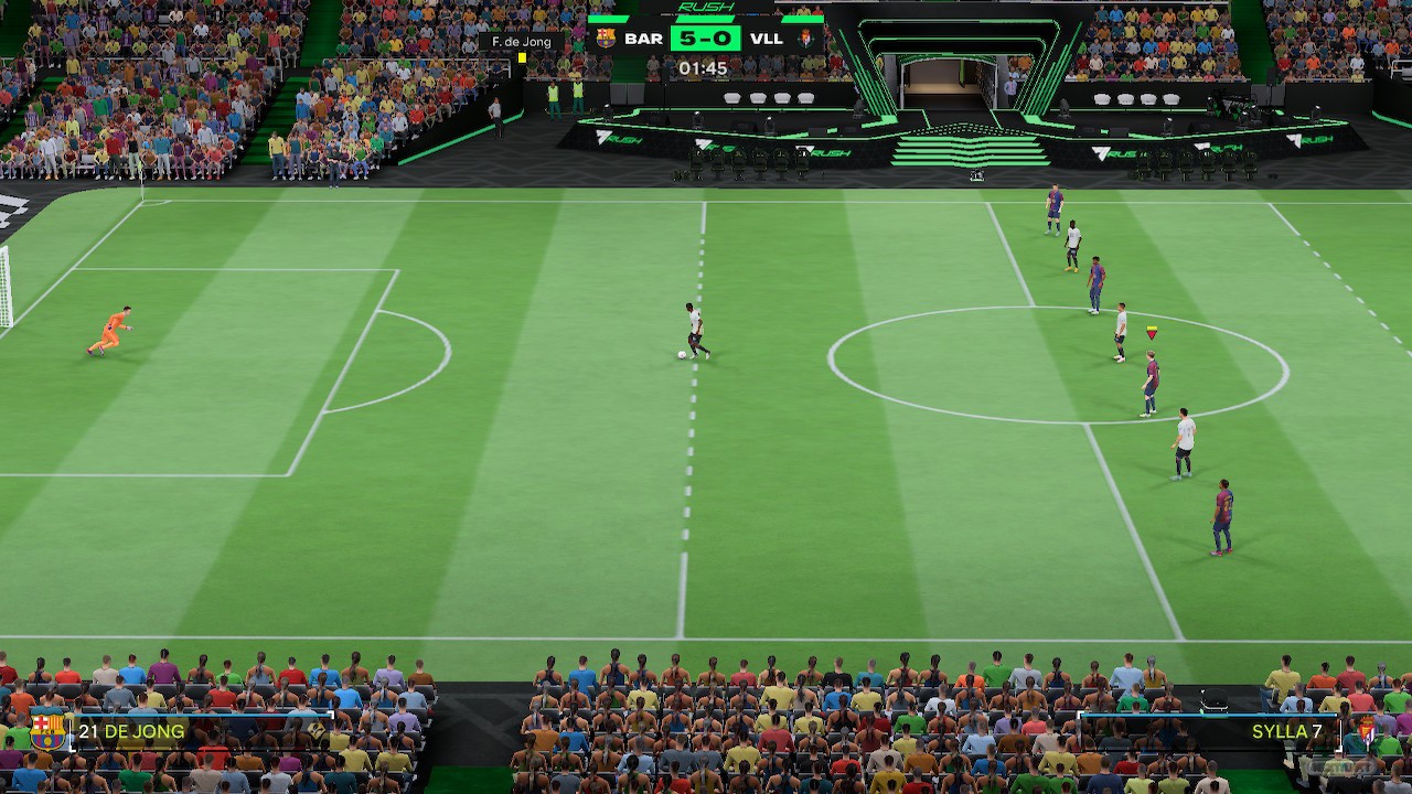 Y es que, si lo tuyo es coger el mando y divertirte, en EA Sports FC 25 se estrenan los partidos Rush, que llegan para ocupar el lugar de Volta como exponente de fútbol rápido y desenfadado. En ellos se cambia el estilo callejero repleto de filigranas inverosímiles por desenfrenados 5 contra 5, en estadios reducidos y normas que parecen inspiradas en competiciones como la Kings League. Por ejemplo, en lugar de con el clásico saque inicial, los enfrentamientos comienzan con el balón rodando desde una banda hacia el centro del terreno de juego y los jugadores de ambos equipos (excepto el portero) corriendo hacia él para hacerse con su control. ¿Te suena de algo?