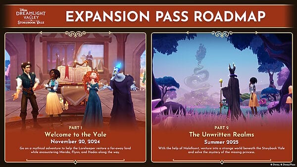 - El 20 de noviembre de 2024 llega un nuevo pase de expansión llamado «The Storybook Vale», que incorporará tres nuevo biomas para el valle: The Vale, Bind, Everafter y Mythopia, así como nuevos personajes de Disney, contenidos y mascotas, estando divido en 2 fases de llegada.