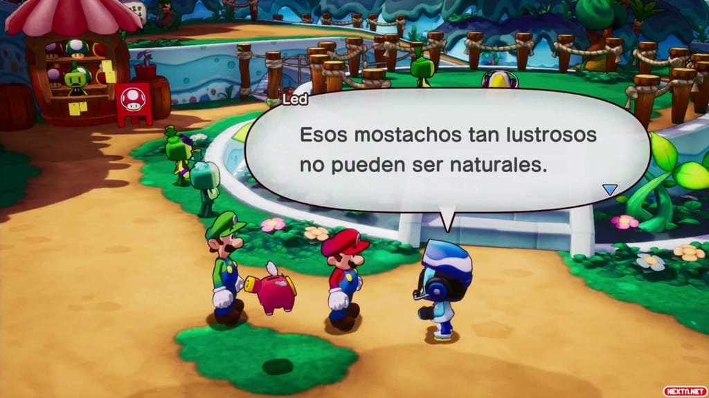 Sin entrar en detalles sobre la historia del juego, podemos deciros que Mario y Luigi se ven envueltos en una aventura donde las conexiones, literalmente hablando, son la clave. Nuestros protagonistas tienen que unir las diferentes islas en las que ha quedado dividido el mundo con la ayuda de Porcopolo, un personaje que NO es un cerdo (o eso dice él) que nos permite realizar las conexiones con las islas, al cumplir ciertos requisitos. Como ya podéis intuir, solo por el nombre de ese personaje, la localización a nuestro idioma sigue siendo tan única y original como siempre y, los diálogos, pueden llegar a ser tan absurdos como divertidos.