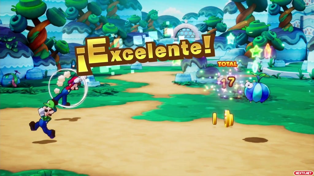 Como es habitual en esta serie de RPG, hay secciones de plataformeo, combates por turnos y puzzles que resolver mientras exploramos el mapa, en esencia, los fundamentos de la saga Mario & Luigi se ven intactos. Nuestra experiencia jugando los diversos fragmentos que hemos podido probar del juego ha sido muy positiva, se sentía familiar, pero a la vez nuevo. El estilo artístico también destaca, luciendo genial en la pantalla del televisor (no hemos podido verlo en Modo Portátil). En cuanto al combate, hemos podido utilizar técnicas básicas como el salto o el martillo y el caparazón verde como ataque tándem. Como es seña de identidad de esta saga de juegos, la precisión con la que pulsamos los botones, el «timing» es clave, potenciando enormemente nuestros ataques o permitiendo que esquivemos los ataques enemigos sin recibir daño. Hay ciertas novedades en las batallas como las «Clavijas de combate», que añaden ciertos efectos pasivos y que se pueden fabricar utilizando diferentes materiales que obtenemos al ganar batallas o explorar, pero a grandes rasgos, el combate característico de la saga se mantiene y eso es muy bueno.