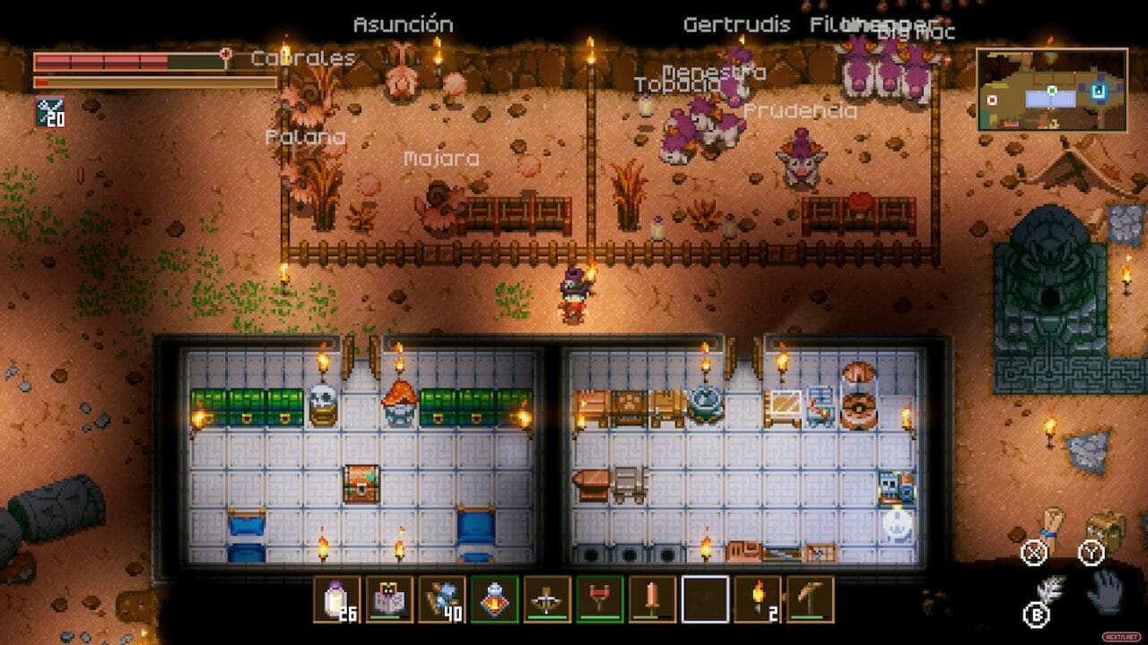 También hay que decir que esto solo es una porción pequeñita de la experiencia, y que la base de su jugabilidad es adentrarnos a golpe de pico, maza, taladro, etc., más y más en su titánico mapeado, luchar contra enemigos y hordas de ellos con las armas y armaduras que vayamos forjando, o encontrando por el camino, regresar a nuestra base para aliviar la carga de nuestros limitados (pero crecientes) huecos de inventario, construirla para reforzarla, hacerla más grande, plantar cultivos, cuidar animales, actualizar mesas de creación… Todo esto se convierte en un proceso muy amigable y disfrutable, en el que siempre te encuentras haciendo cosas diferentes, convirtiendo la experiencia en una muy dinámica.