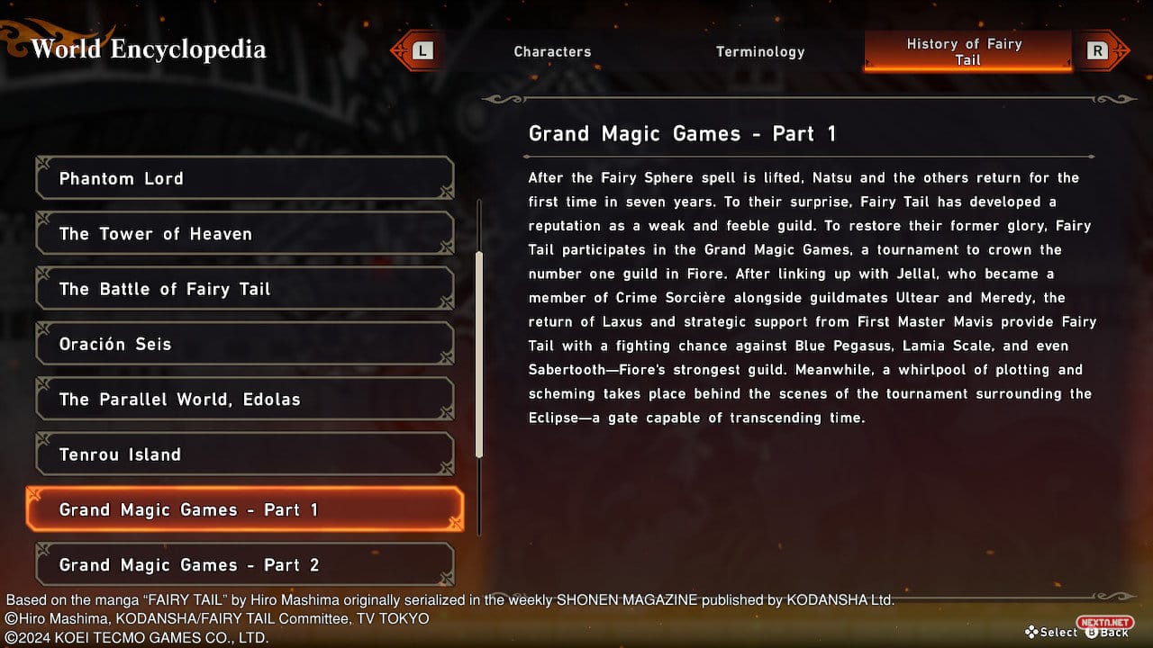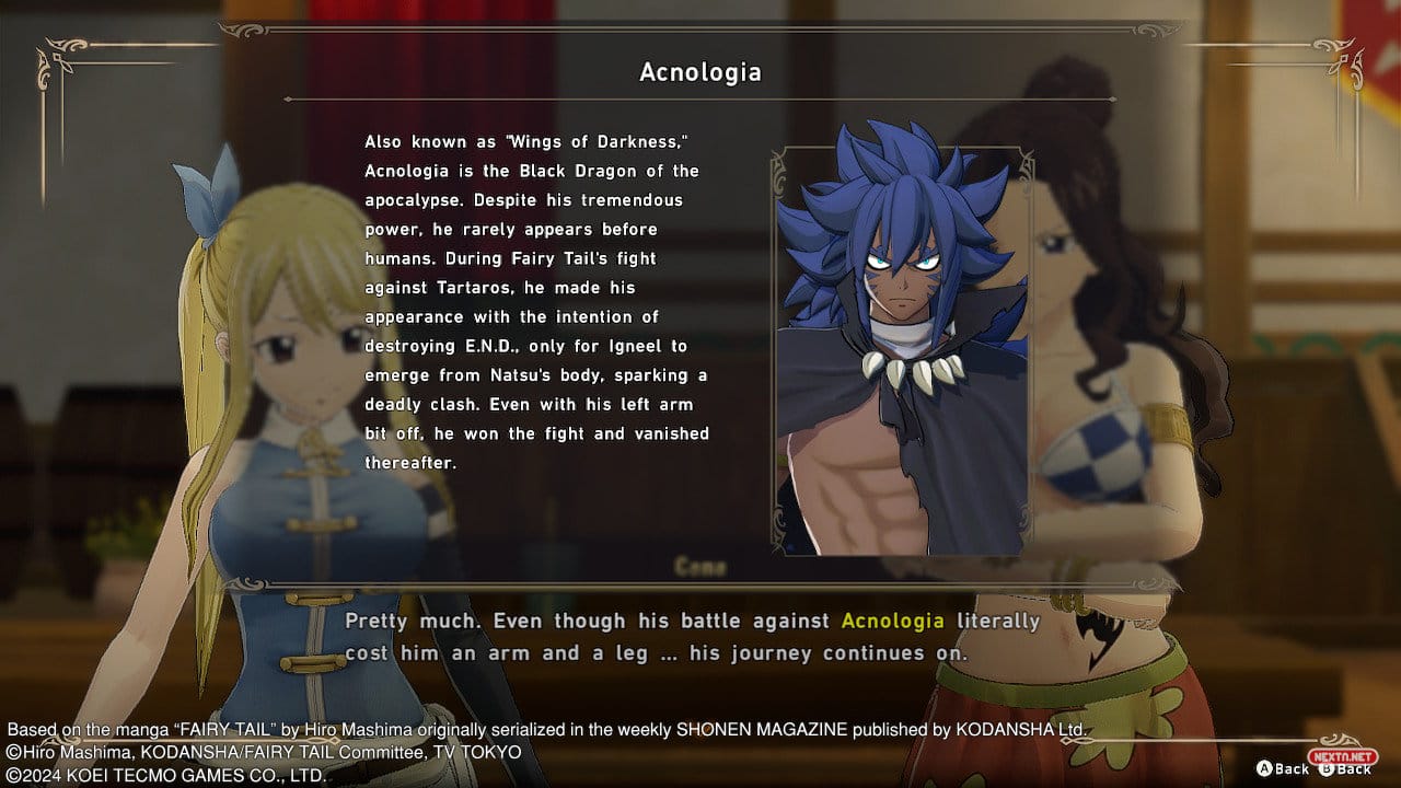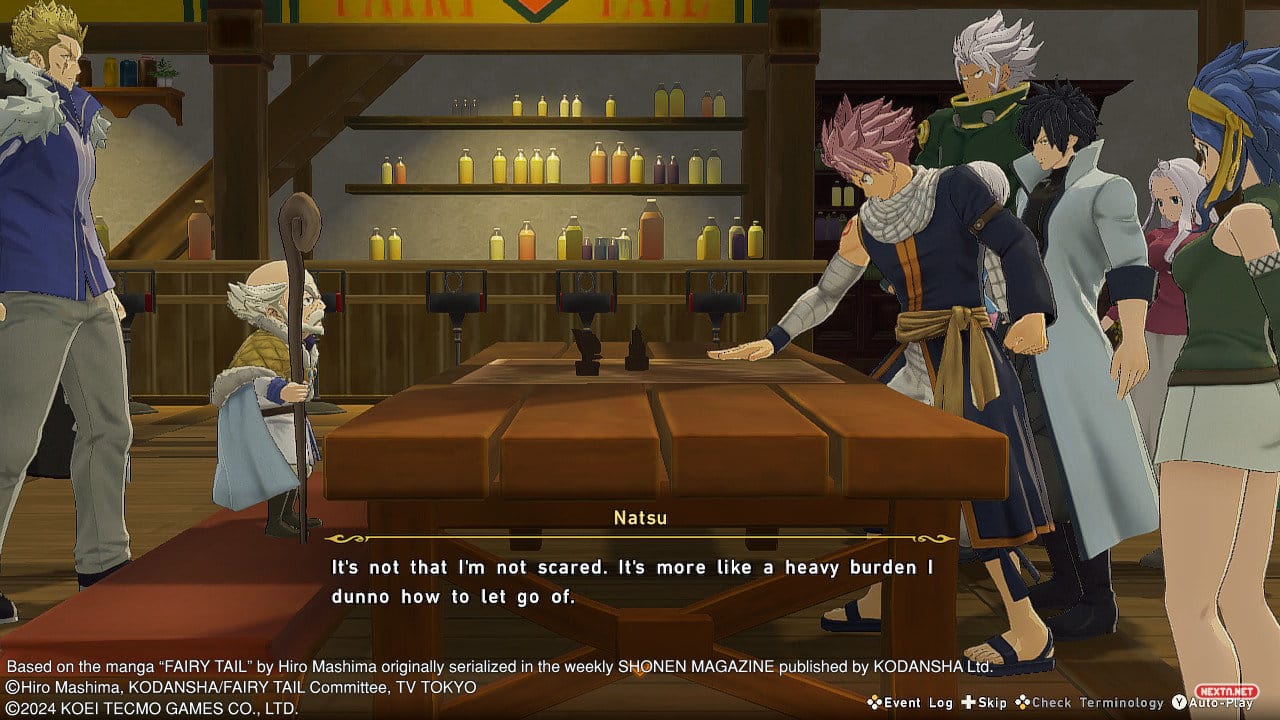 Llegados a este punto, va siendo hora de hablar de qué es necesario para poder disfrutar de esta propuesta. Si bien es cierto que es recomendable haber visto el anime o el manga, Gust tomó medidas para que cualquiera pueda subirse a este tren. De cara a situar a sus jugadores, Fairy Tail 2 dispone de un glosario que entra en escena cada vez que sale un término o personaje relevante, así como una enciclopedia que podéis consultar para ver resúmenes de los acontecimientos más relevantes que tuvieron lugar antes del arco del Imperio Alvarez. Asimismo, a lo último hay que sumarle que de con cierta frecuencia es posible ver a personajes reflexionando acerca de cosas del pasado, por lo que no es demasiado complicado que alguien que llega de nuevas se adapte. Por cierto, contando el prólogo, este título posee 12 capítulos principales y 4 adicionales con contenido original. No vamos a entrar en detalles de qué pasa en los cuatro capítulos que inventó Gust, pero os adelantamos que en el «post-game» os espera comedia, pinceladas de fanservice, bastante exploración y algunos de los combates más difíciles. En cuanto a la duración, completar la historia principal lleva más de 20 horas y el tema se puede alargar dependiendo de lo mucho que explores y lo completionista que seas buscando coleccionables, sacando eventos de personajes o derrotando a todos los jefes secundarios. Por ejemplo, completarlo prácticamente todo de cara al análisis, le llevó unas 35 horas al redactor de este texto.
