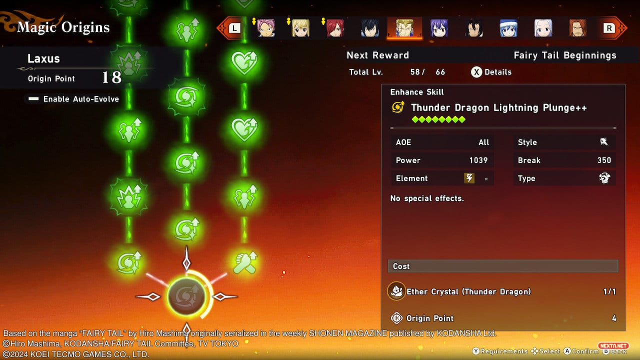Por si había alguna duda, te confirmamos que los enemigos también son capaces de realizar ataques poderosos que conviene interrumpir. Cuando van a usar una habilidad de esas, durante un breve periodo de tiempo aparece un icono que indica qué tipo de golpes debes propinarle y si tu personaje no posee lo necesario, no te queda otra que rotar a alguien que se adapte a las circunstancias o ponerte en posición defensiva para mermar los daños si ves que no vas a conseguir frenar la arremetida de tu rival. En otro orden de cosas está la mecánica del «Awakening», que se resume en que de una a tres esferas individuales se van llenando mientras combates y consumirlas permite potenciar temporalmente al usuario, da acceso a habilidades únicas y algunos personajes como Wendy incluso cambian de forma («Dragon Force», «Iron Mode», etcétera). Aparte de para desbloquear eventos de personajes, el árbol de habilidades llamado «Magic Origin» también cumple su cometido esperable. Cada personaje está ligado a un árbol y ya sea para desbloquear nuevos hechizos o mejorarlos, para aumentar estadísticas o para potenciar los «stats» del grupo en general, debes invertir recursos y puntos que te dan al subir de nivel. Si esto último no te gusta, ten presente que es posible hacer que el juego asigne los puntos por su cuenta. Ya para terminar este párrafo, falta mencionar que existen «lacrimas» que al equipárselas a alguien lo refuerza o causa efectos como reducir las posibilidades de que le ataquen. Del mismo modo, es posible darle más alas a las «lacrimas» de rango alto poniéndoles una serie de piezas, aunque ya te adelantamos que esto no lo vas a echar en falta salvo que juegues en difícil, porque aunque los combates ofrecen un desafío decente, no son tan exigentes.