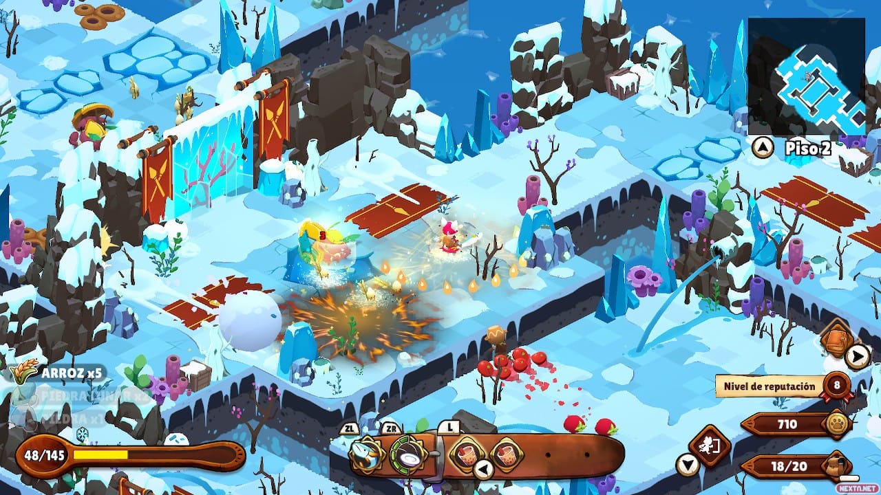 Es hora de hablar de los dos grandes aspectos de Cuisineer, empezando por el mazmorreo. Al más puro estilo roguelite, tenemos a nuestra disposición varias regiones, y al entrar, se genera una mazmorra aleatoria. No excesivamente aleatoria, ya que se repiten salas y algunos patrones de monstruos, pero lo suficiente para que cada partida sea entretenida. En las mazmorras no tenemos mayor objetivo que derrotar a todo bicho que se nos ponga por delante para reunir ingredientes, y hay que reconocerlo, el juego cuenta con mucha originalidad: por supuesto que las gallinas dan huevo y carne, pero también tenemos pequeñas bolas de pelo que sueltan harina, guindillas que escupen fuego o soldados de trigo, entre otras criaturas curiosas. Y las armas de Lichi tampoco se quedan atrás, ya que tenemos desde espátulas y cuchillos hasta sardinas y bombas huevo. Además, estas armas cuentan con características pasivas de todo tipo para darnos más ventaja en el combate. A nivel de control, el sistema de combate es sencillo, pero es al añadir los efectos secundarios cuando se añade más profundidad a la estrategia de combate.