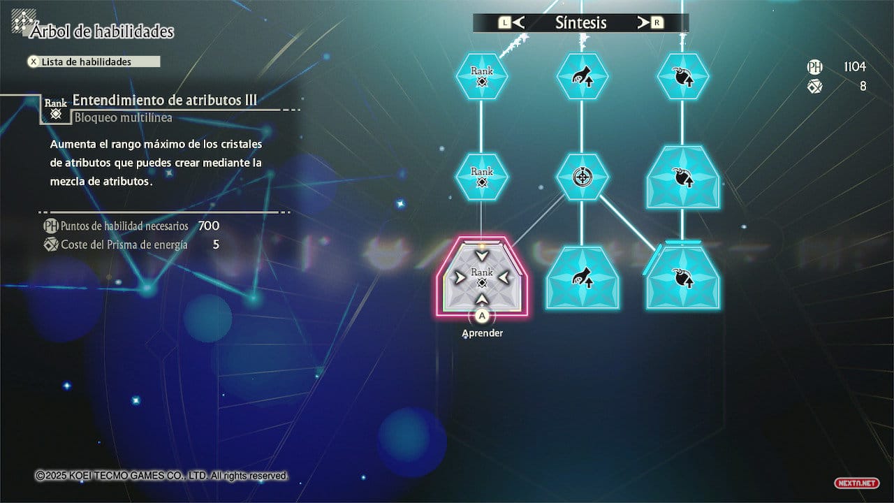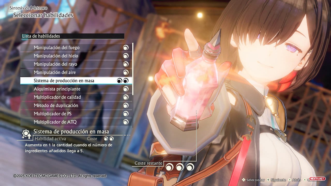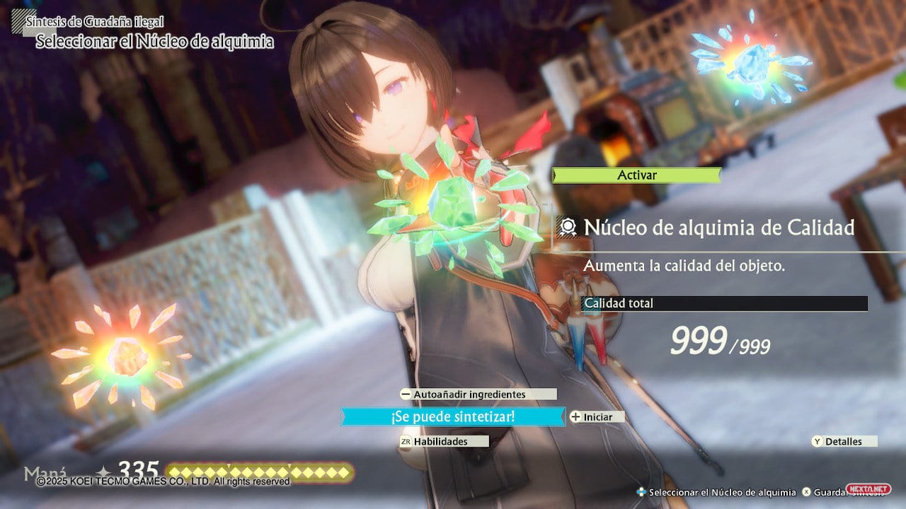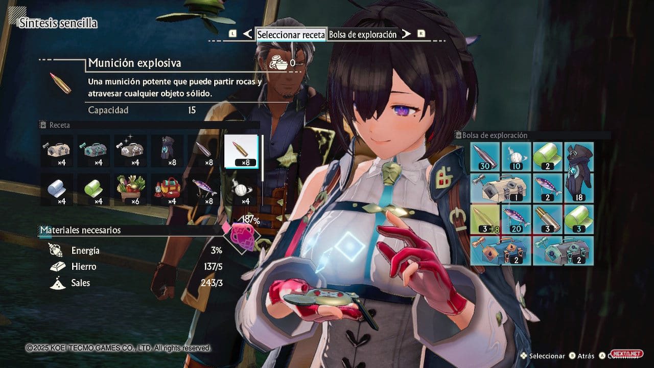 Siguiendo con el hilo previo, está que los «traits» de toda la vida ahora se llaman «atributos» y se obtienen de forma diferente, eliminando en gran medida el factor suerte de la recolección de ingredientes. En lugar de ser rasgos heredados de lo que introduzcas en un caldero, a través de distintos métodos es posible conseguir «cristales de atributos» que son equipables en objetos sintetizados y sobra decir que aumentan el daño de los objetos ofensivos, suben la defensa de armaduras, etcétera. Las únicas pegas es que primero debes desbloquear cada hueco y que no te dejan poner dos cristales del mismo elemento. Cambiando de tema, tenemos las habilidades alquímicas, las cuales se desbloquean mediante el árbol de habilidades, se seleccionan antes de comenzar un sintetizado y sirven para cosas como aumentar el número de artículos que vas a producir. Por otra parte, quiero recalcar una de las mejoras de calidad de vida que más me gustaron de esta propuesta: permiten guardar una síntesis en progreso para continuarla más tarde, lo que te da incluso la oportunidad de reponer stock. Ya para acabar con la alquimia, falta mencionar la síntesis sencilla: se emplea para crear objetos simples de forma rápida, siendo clave para reponer la munición de la bolsa de exploración, hacer kits de reparación de cofres y cosillas similares.