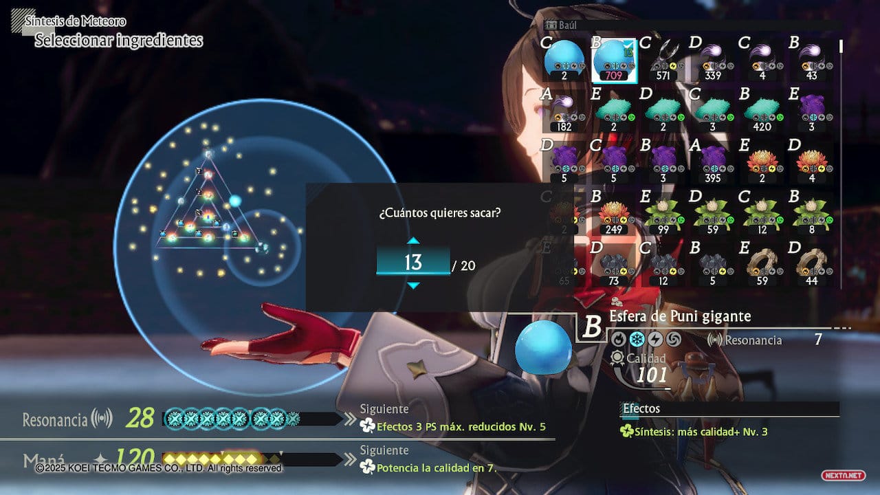 Por su parte, de normal, cada ranura solo admite un ingrediente, esos ingredientes afectan a un rango concreto a través de su «resonancia» y alrededor de ellas flota maná, que aquí se manifiesta en forma de estrellas. El propósito es sencillo: debes darle a las estrellas de maná y a otras ranuras con el rango de resonancia de cada material, pues con cada reverberación que se produce, mejoras el efecto del núcleo y el objeto en general. Como es natural, no todas las ranuras son iguales: por ejemplo, existe una que te permite meter varios ingredientes para que el rango de esa ranura cubra todo el tablero. En cuanto al número máximo de ranuras que tiene cada núcleo, la cosa depende del nivel que posea la receta; si a la hora de recordar una receta gastas pocas partículas de las que se consiguen explorando o combatiendo, las posibilidades del sintetizado son escuetas, mientras que si tiras la casa por la ventana, nada te impide dedicarle media hora a perfeccionar un accesorio. Por cierto, en caso de que este apartado de Atelier Yumia te dé pereza, puedes dejar que el juego te haga un apaño por su cuenta, pero sé consciente de que si deseas crear objetos perfectos o controlar bien lo que se gasta, te toca mancharte las manos.