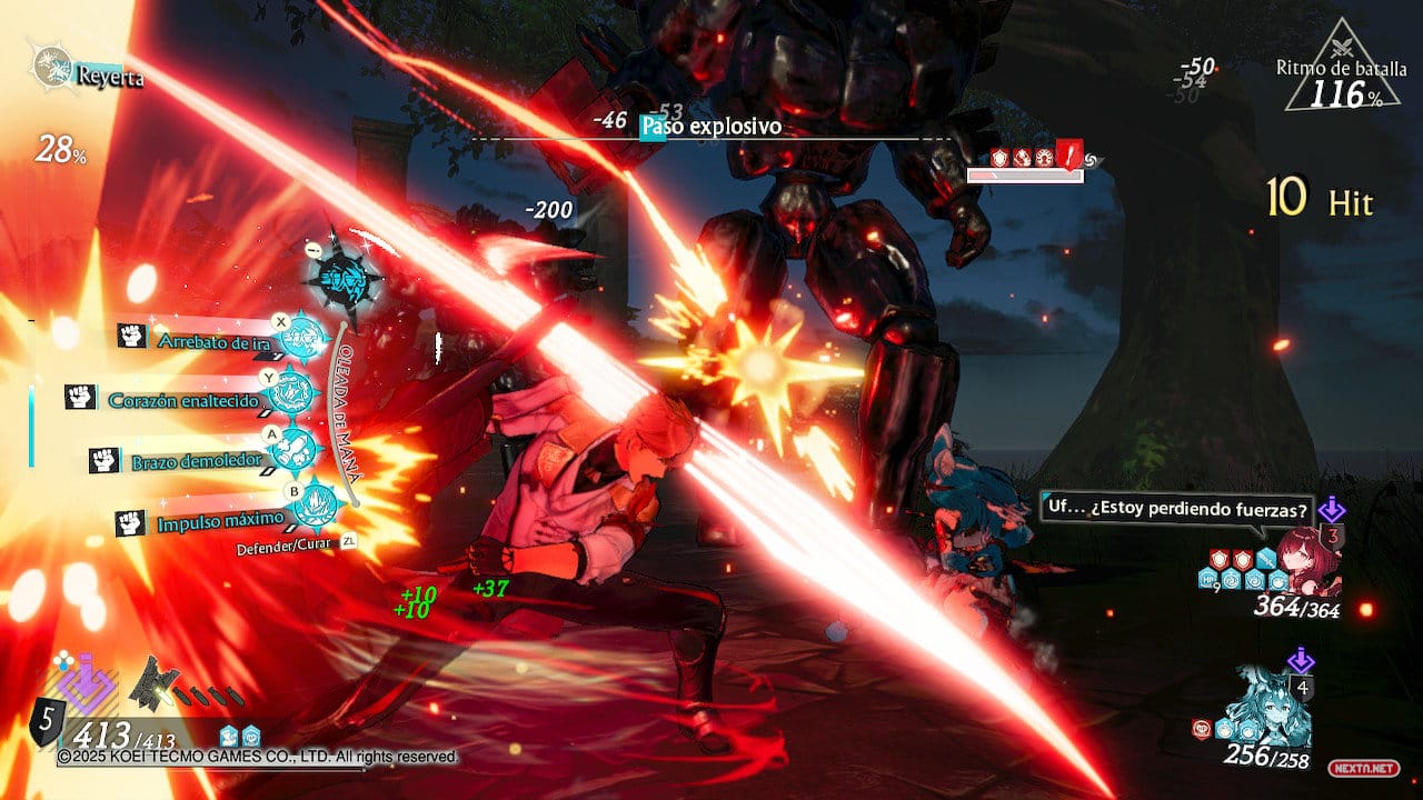 Dejando a un lado que cada personaje posee una particularidad al pelear y que nada te impide configurar la actitud de tus aliados para que usen objetos, se enfoquen en la ofensiva y tal, están las acciones de aliados. Básicamente, cuando un enemigo está aturdido, te dan la oportunidad de atacarle junto a un aliado con un objeto al que sea vulnerable. Con esto propinas un buen golpe, pero recuerda que los usos del objeto se consumen. Y hablando de objetos, en esta ocasión consiguieron que tengan un peso real en el rumbo de las batallas y tu equipo es capaz de equiparse hasta cuatro de apoyo o curativos, mientras que los ofensivos son individuales. En cualquier caso, úsalos sin miedo, porque se recargan al igual que las habilidades y no los pierdes al terminar una contienda. Lo siguiente a explicar son las oleadas de maná; cada vez que emplees un objeto, un medidor se rellena en base a lo poderoso que sea y tras llegar al 100%, te dejan activar la oleada. En ese estado, el usuario cambia su set de habilidades a uno más poderoso y el medidor empieza a caer en picado, volviéndose un succionador de salud si llega a 0, por lo que es recomendable que uses antes el ataque definitivo del personaje para evitar que sea derrotado.