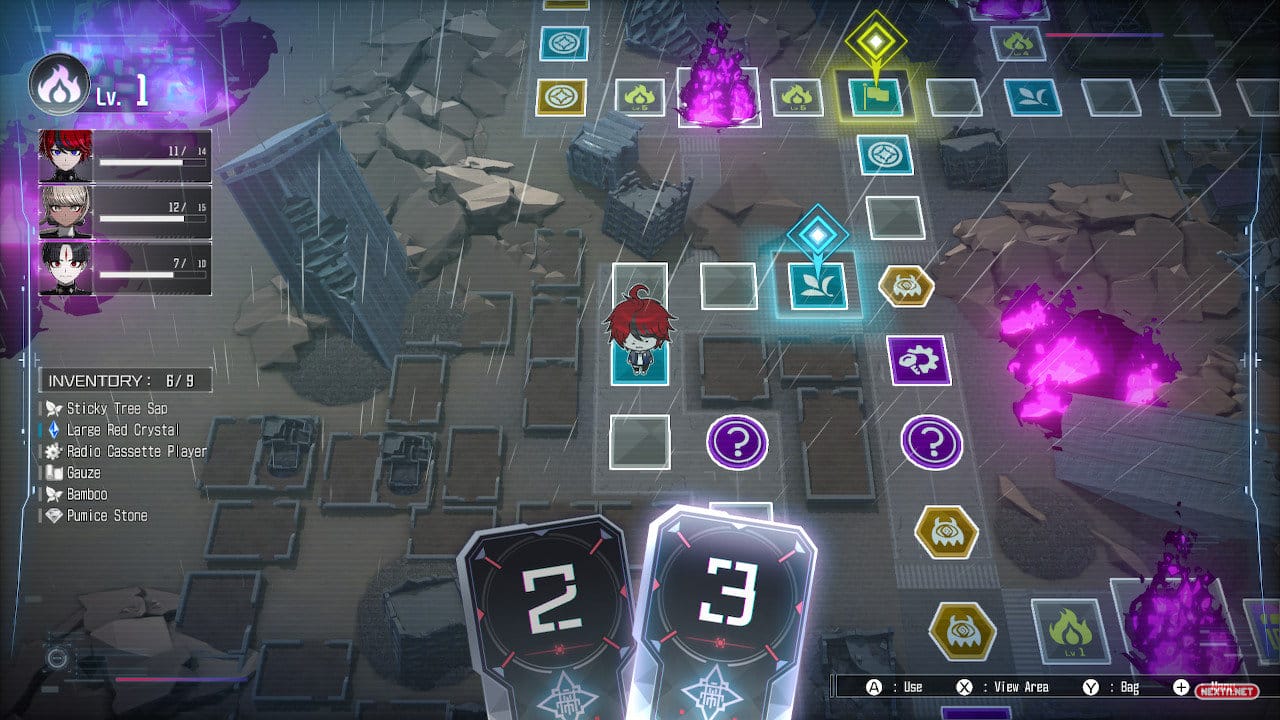 Alejándonos de la acción directa, hablemos de la exploración, la cual dista de ser la punta de lanza de The Hundred Line. Hay dos tipos: la interna y la externa a la academia. La primera no tiene mucho misterio y se resume en atravesar pasillos o hacer un viaje rápido hasta llegar al lugar o al servicio que desees para mejorar trampas o habilidades, crear regalos, etcétera. Por su parte, la externa recuerda a un juego de mesa, empleando un tablero en el que la suerte es relevante. En este caso, seleccionas hasta cuatro luchadores para la expedición, al comienzo de cada turno te dan dos cartas al azar para que escojas cuánto te vas a desplazar para intentar pillar objetos, materiales o dinero. Y sí, este trío, junto a las habilidades académicas que obtienes mediante eventos secundarios breves o en la biblioteca, son necesarios para disfrutar de los servicios que mencionamos antes. Por último, falta recalcar que el groso de los diálogos de esta propuesta sucede dentro de una novela visual de corte tradicional, que en ocasiones permite tomar decisiones.