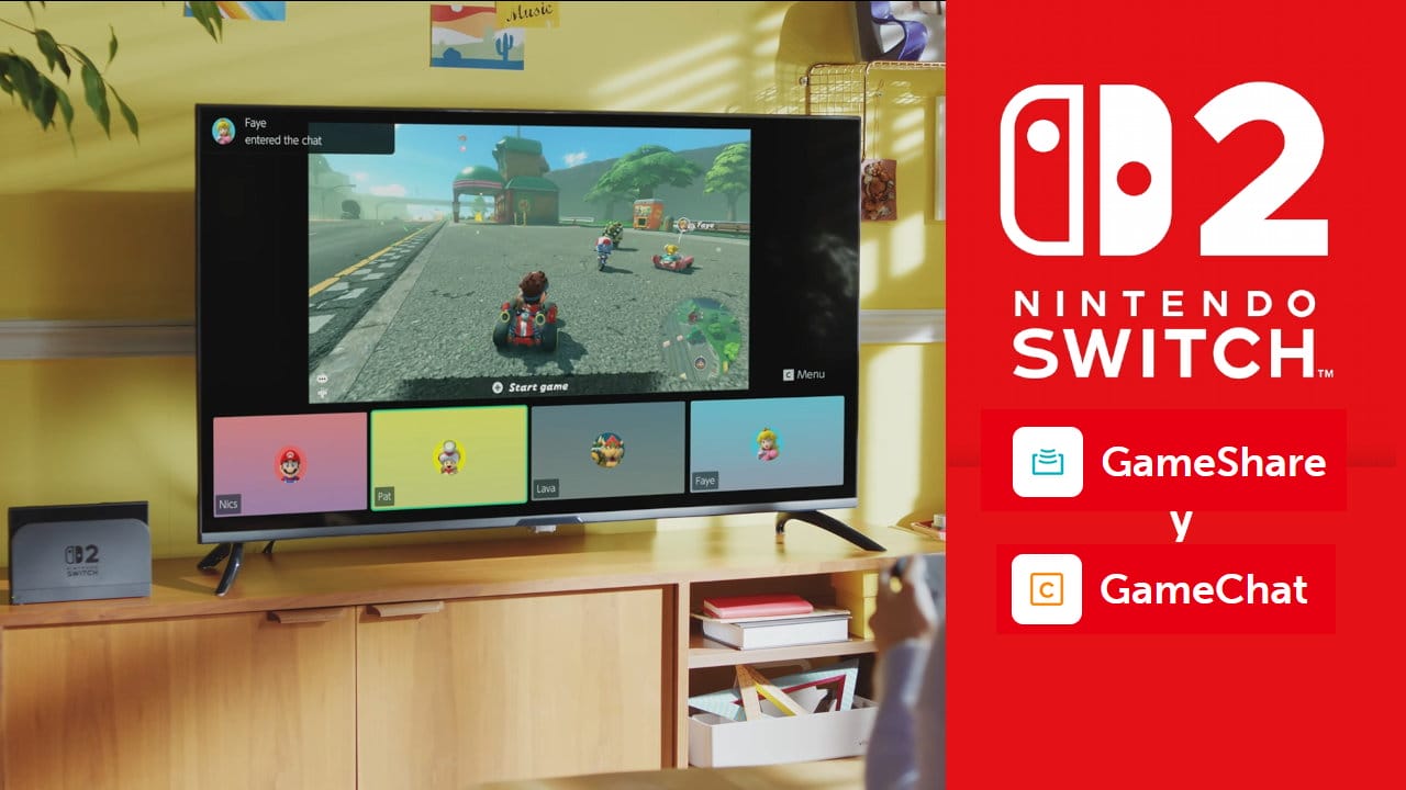 Es la nueva función de comunicación de Nintendo Switch 2, en la que podrán participar hasta 12 amigos en una misma llamada. Se podrá acceder a través del nuevo botón C de los Joy-Con 2, el mando Nintendo Switch 2 Pro Controller o el nuevo mando de GC. En pantalla puedes elegir cómo ver a los participantes, haciendo la pantalla de juego más pequeña para acomodar las ventanitas de los participantes, o con la pantalla de juego a tamaño completo, siendo el tamaño de las ventanas ajustables.