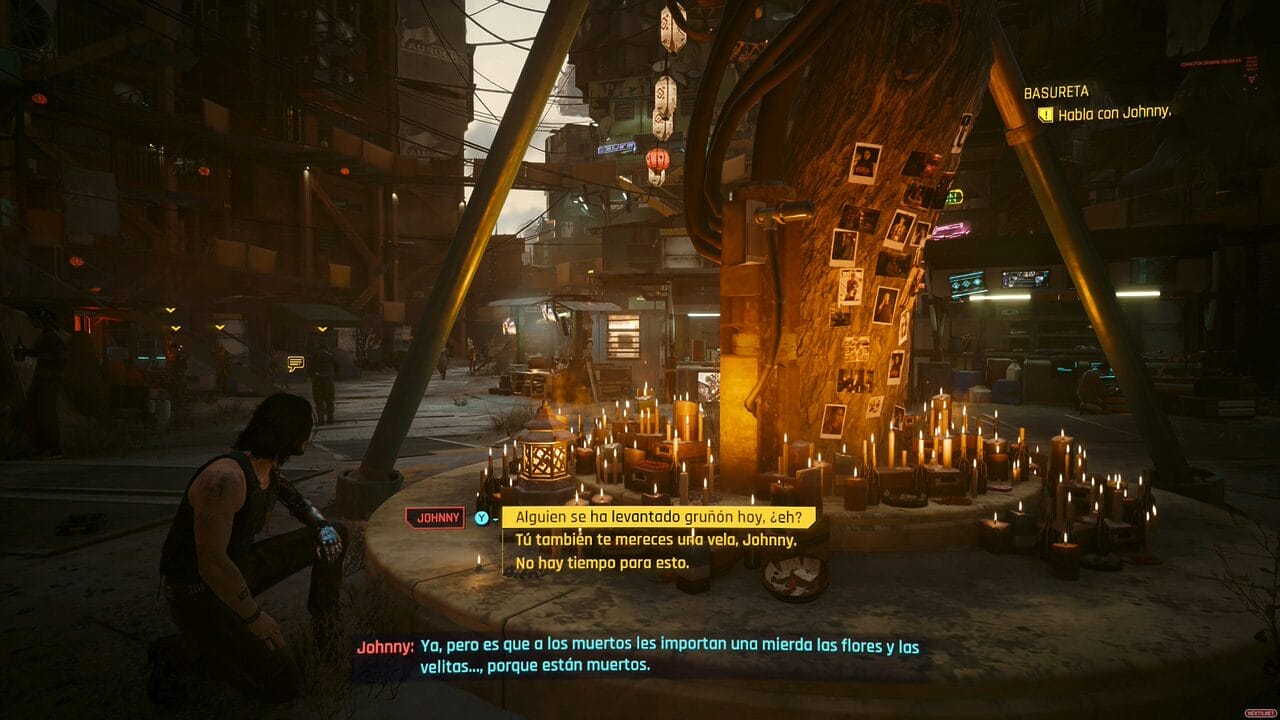 Hay una cuestión que ya admiraba en The Witcher 3, que he visto replicada en este juego. Supongo que es sello de la casa. En ese videojuego asumíamos el papel de Geralt de Rivia, decidiendo lo que él contestaba en todo momento, y así su destino. Sin embargo, a la hora de escoger sus respuestas, estas podían cambiar un poco con respecto a lo que nosotros decidimos. Y es algo que me encanta que ocurra también al asumir el papel de V. No es un personaje cuyo destino está ligado a nuestras decisiones, sino que tiene una personalidad desbordante, y lo demuestra con cada perla que sale por su boca.