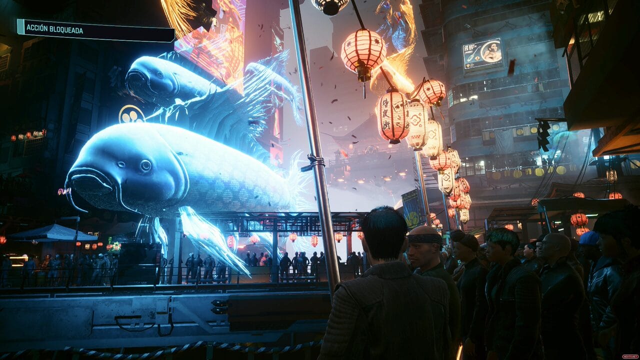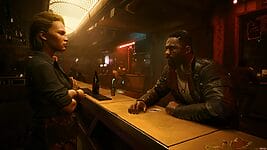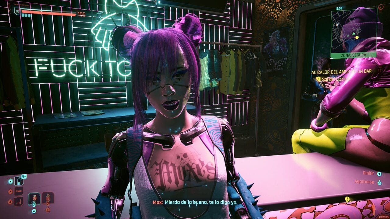 La actuación de los personajes no solo se nos transmite gracias al doblaje de cada uno de ellos (dicho sea de paso, con una versión en español de España y latinoamericana digna de elogio, signo de la riqueza y diversidad cultural de Night City), sino también gracias a la tecnología tras este videojuego. Las caras, así como las expresiones faciales, el pelo, la piel, ya sea sintética o humana, incluso la ropa… todo está creado con un mimo al detalle apabullante, que nos hace sentir que son casi reales. Bien cierto es que han pasado años desde el estreno de este videojuego, y que títulos actuales como la remasterización de The Elder Scrolls IV: Oblivion de Bethesda nos han hecho ver que se pueden crear personajes incluso más realistas. Sin embargo, la expresividad de los personajes de Cyberpunk, sus tics, sus gestos corporales, hace que te sumerjas en tus charlas con ellos haciéndote creer casi que se trata de personas reales con sus problemas reales.