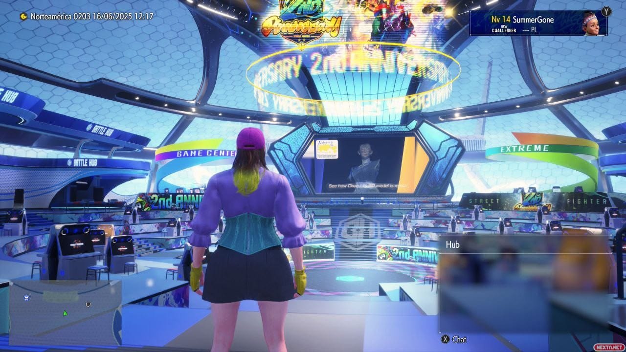 Después tenemos Fighting Ground, que se puede considerar la parte más tradicional del juego. Tiene el modo arcade con las historias personales de cada luchadore, tutoriales, combates personalizables para jugar en la misma consola o también a través de comunicación local y en línea. Es la forma más sencilla y directa de acceder a la esencia de Street Fighter 6. Pero si lo que buscáis es la parte más “conectada” de todas, entonces tenemos que hablar de Battle Hub, una renovada sala de reunión en la que puedes interactuar con otres jugadores, personalizar a tu personaje, participar en eventos y, por supuesto, luchar sin parar. Si bien se puede luchar también por Internet a través de Fighting Ground, Battle Hub concentra todas las actividades en línea y lo hace de la forma más llamativa y reluciente posible.