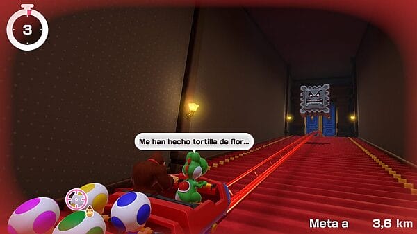 - Feria frenética: Modo cooperativo para hasta 4 participantes (con un mínimo de dos personajes en pantalla: si estás solo el otro participante será un personaje controlado por la CPU, y si sois 3 igual hasta completar los 4) en el que se explota a tope el modo ratón de los Joy-Con 2. Básicamente se trata de una montaña rusa en la que tendremos que derrotar enemigos por medio del puntero del ratón para ganar tiempo y poder ir lo más lejos posible en una de las cinco diferentes rutas propuestas. Al llegar determinados puntos que sirven de checkpoint, saltará un minijuego de ratón de entre los 14 disponibles. Puede llegar a ser divertido, pero no es tan emocionante como nos habría gustado. Otro «punto débil» es que, pese a que Nintendo dice que podemos jugar con el modo ratón incluso sobre nuestro pantalón, no te sentirás muy hábil en algunos minijuegos, y estar tirado en el sillón de tu casa junto a 3 participantes más puede ser un pelín incompatible. Las reglas que hemos comentado son para 4 de las 5 posibles en Feria frenética; la quinta ruta es un modo supervivencia en el que el Bowser de pega nos pisa los talones y tendremos que alejarlo a base de superar minijuegos.