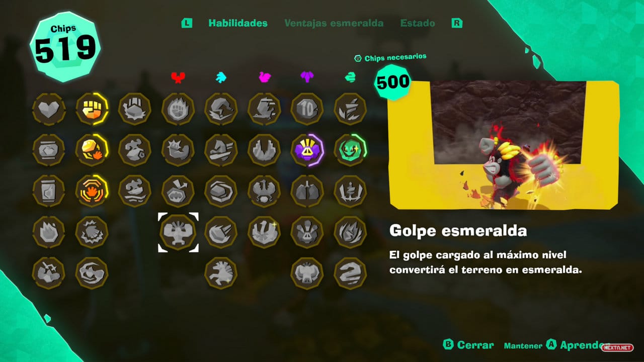 A continuación, toca hablar de lo más llamativo del DLC para muchos, la caza de esmeraldas. A efectos prácticos, estamos ante un modo roguelike, en el que cada caza la empezamos sin la compañía de las habilidades que adquirimos con gemas de banandio durante la aventura principal. Además, a partir de la dificultad 3 en adelante (hay 7), se aumentan las rondas a superar y ni siquiera comenzamos con las bananzas de DK disponibles, por lo que para usarlas debes desbloquearlas, en gran medida, teniendo suerte con lo que te toca.