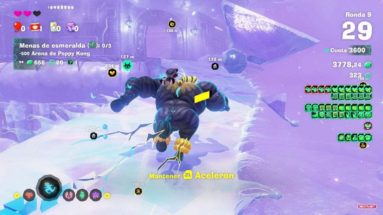No obstante, el modo cuenta con una baza para ser desafiante: cada ronda tiene un tiempo límite, que corre en nuestra contra mientras debemos cumplir con las cuotas de Void. Ni que decir tiene que lo que pide por ronda va subiendo y que dichas peticiones son mucho más elevadas si optas por jugar en una dificultad superior (sí, también se mejora tu premio). Por lo demás, básicamente usan el estrato de la Isla de Donkey Kong y cinco que visitamos en el pasado como escenarios. ¿Hay algún aliciente extra para jugar a esto? Aparte de cobrar chips convencionales y experimentar el resto de la trama tras obtener todos los premios, después de cada caza de esmeraldas nos enseñan un informe con nuestros resultados y hay un sistema de puntos con el que conseguir ropa nueva, música, un mayor repertorio de bonificaciones posibles y como ya te estás imaginando, hay que acumular puntos para poder acceder a la sección roguelike de todos los estratos.