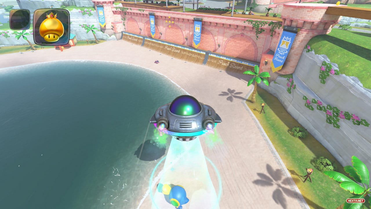 A continuación, toca explicar el único método real que he encontrado. A partir de la versión 1.3.0 de Mario Kart World, si buscas bien por los escenarios en el modo libre, a veces encontrarás a ovnis prácticamente escondidos. Estos ovnis se caracterizan por volar a baja altura, quedarse quietos en un sitio y estar en «modo succión» de forma constante. Es más, si te diriges a alguno de ellos verás cómo te absorberán y acto seguido, tomarás el control de la nave.