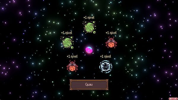 Y hablando de combinaciones, existen distintos tipos de bolas, cada una con su efecto y todas se pueden combinar entre sí conforme subimos de nivel derrotando enemigos y vamos eligiendo cúal queremos equiparnos. Pero algunas combinaciones específicas pueden ir más allá de la combinación y pueden evolucionar en 60 nuevos tipos de bolas, que a su vez pueden combinarse con otras bolas o incluso volver a fusionarse y evolucionar en otras bolas completamente distintas. Ahora os pido que os pongáis a sumar combinaciones y posibilidades de las que ya hemos hablad; añadid que también se pueden conseguir objetos pasivos que modifiquen la jugabilidad durante cada partida. Llenad la pantalla de enemigos y haced que cada vez que una bola coche con uno de ellos, salga un efecto distinto y un numerito asociado. Correcto, se desata una locura de luces y colores.