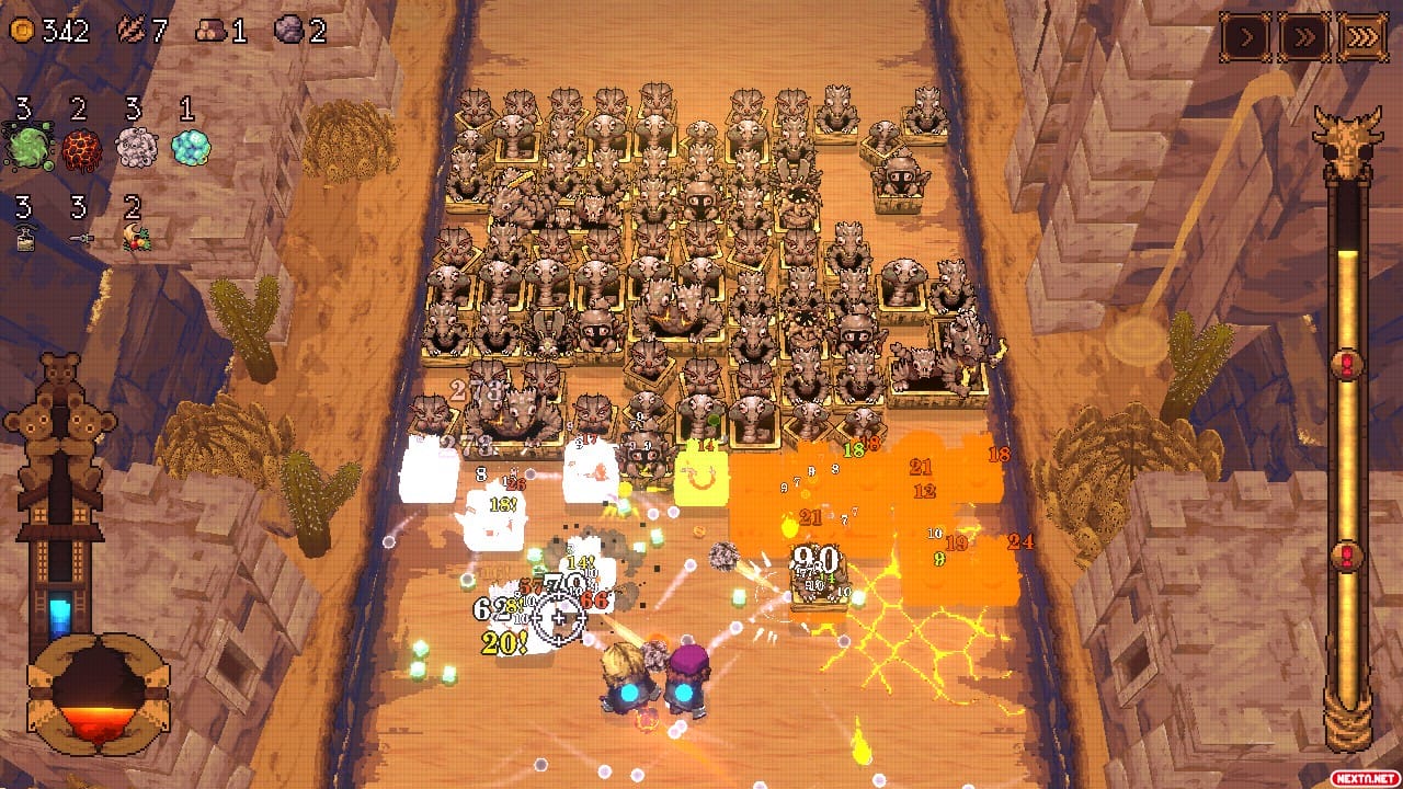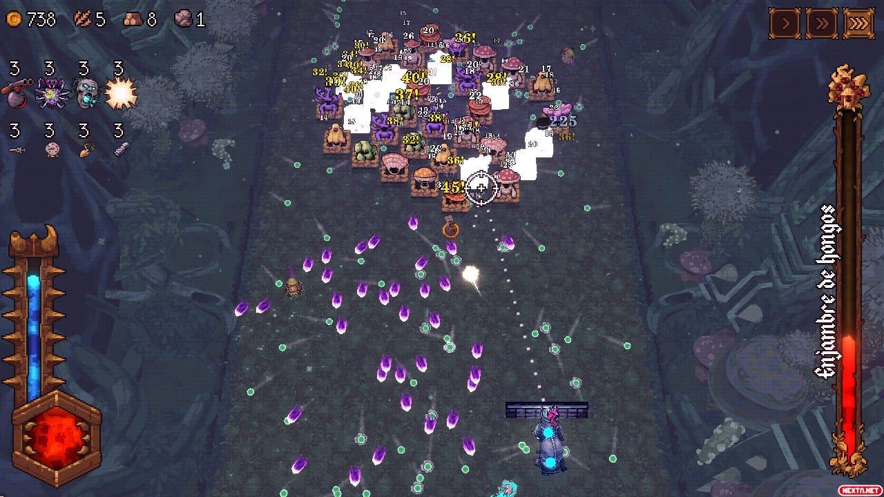 Y es que además de un juego que mezcla lo arcade de Arkanoid con el roguelite, BALL x PIT también tiene mucho tanto de Bullet Hell, como de Bullet Heaven, porque si bien es cierto que nuestro personaje puede acabar disparando decenas de bolas como puede ocurrir en Vampire Survivors, también hay una parte muy importante de esquivar muchas balas y gestionar los espacios de los danmakus. Por suerte, el juego cuenta con varias velocidades, para que cada uno lo adapte a su ritmo y reflejos.