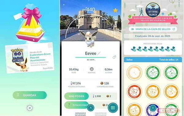 Y aquí está la novedad de los Safari, la caza de sellos de Valencia. Repartidos por la ciudad hay ciertas poképaradas en lugares emblemáticos de la ciudad en los que se puede conseguir un sello safari en Pokémon GO: La Estación del Norte, el Ayuntamiento, las torres de Serranos, la plaza de la Virgen… Había por toda la ciudad. De ahí que para conseguir el máximo hubiera que caminar.