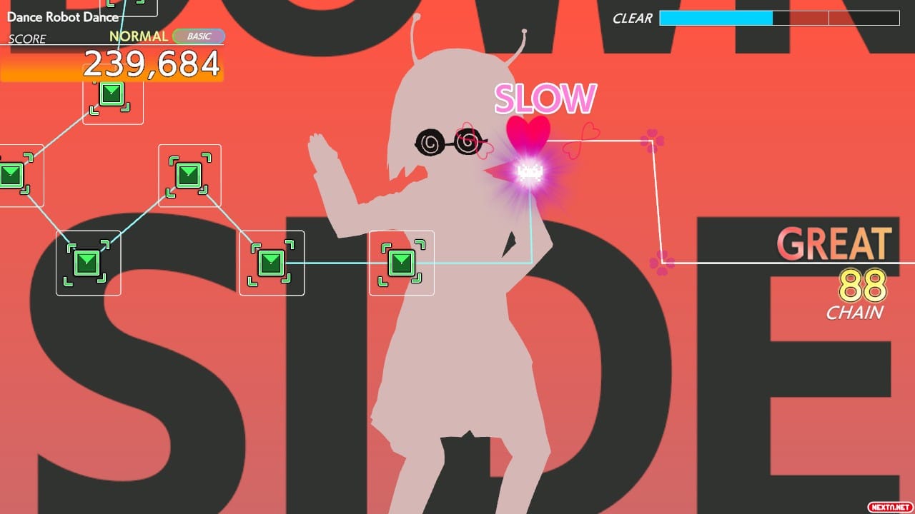 Quizás la otra gran critica es el cambio de la jugabilidad. Si bien sigue siendo la misma, se ha eliminado por completo las notas secretas (ad libs), las notas de pulsar repetidamente, de rasgar los sticks y las diagonales; todas estas notas clásicas de la jugabilidad de la franquicia. En su lugar se han añadido unas notas cuadradas en las que deberemos de pulsar los botones L o R, y en el modo de juego avanzados se introducen notas de colores rojos y azul que debemos de pulsar a la vez en con un botón del lado izquierdo del mando y otro del lado derecho y combinaciones de notas donde debemos de mantener pulsado un botón con una mano mientras que con la otra pulsamos un botón en la dirección indicada. Y sinceramente, son cambios a los que cuesta acostumbrarse. No puedo emitir aún un juicio de si son a mejor o a peor, pero si me preguntáis una opinión creo que se han hecho para simplificar la experiencia a los nuevos jugadores, sobre todo en el esquema de control simple.
